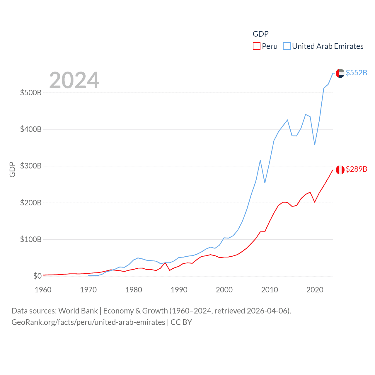 By GDP, Peru ranks 49/197 ($289B) and The United Arab Emirates ranks 27/197 ($552B). By GDP per capita, Peru ranks 91/197 ($8,452), while The United Arab Emirates ranks 24/197 ($50,274).