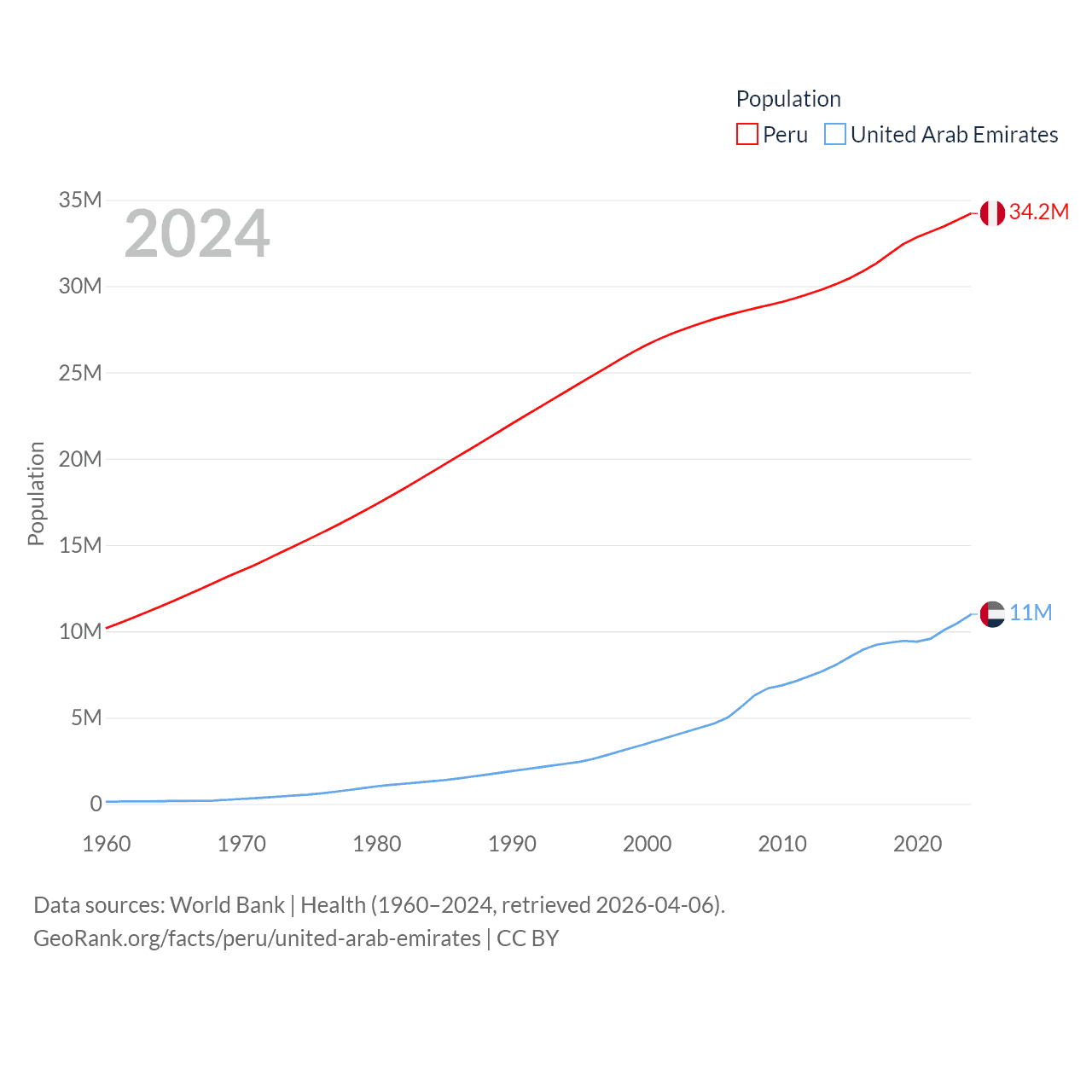 Peru has a population of 34.2M (ranked 48/197), compared with 11M in The United Arab Emirates (ranked 86/197). Peru's land area is 494,211 sq mi versus 27,421 sq mi for The United Arab Emirates (ranked 19th vs. 117th).