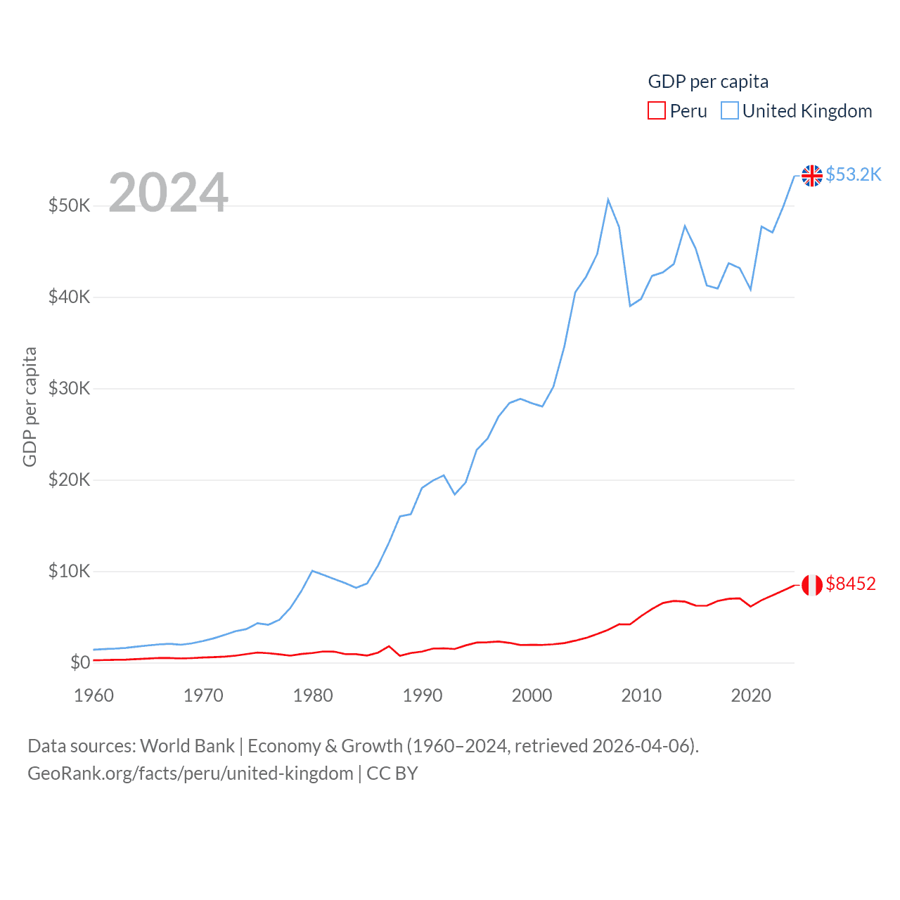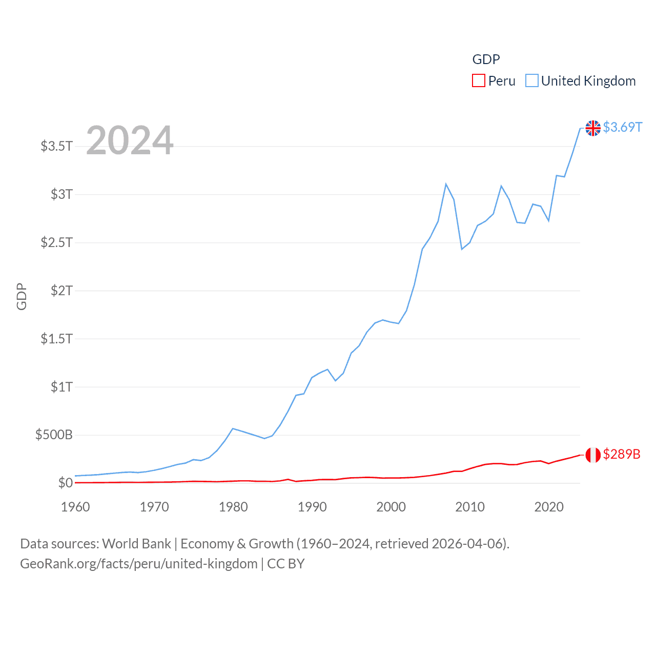 By GDP, Peru ranks 49/197 ($289B) and The United Kingdom ranks 6/197 ($3.69T). By GDP per capita, Peru ranks 91/197 ($8,452), while The United Kingdom ranks 22/197 ($53,246).