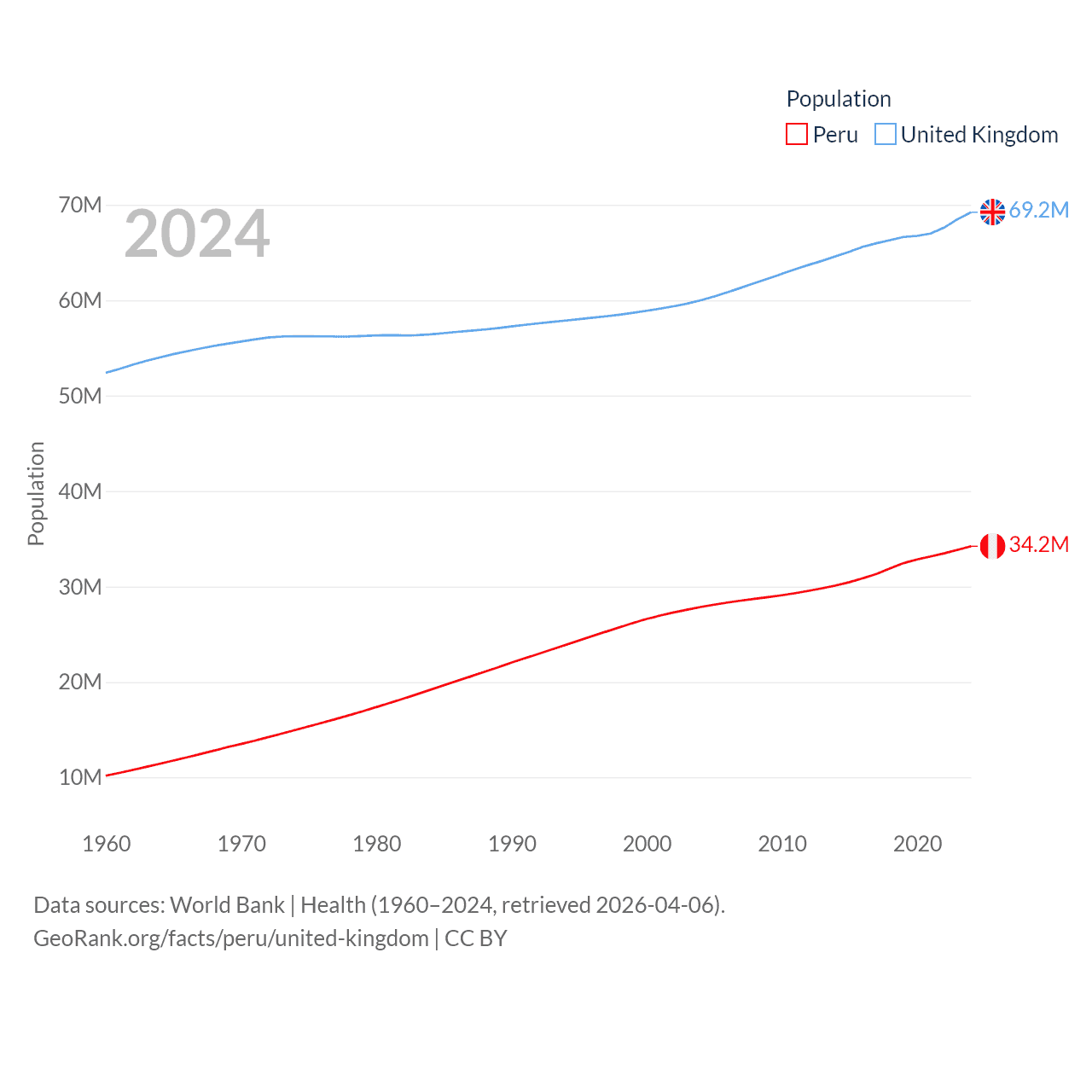 Peru has a population of 34.2M (ranked 48/197), compared with 69.2M in The United Kingdom (ranked 21/197). Peru's land area is 494,211 sq mi versus 93,410 sq mi for The United Kingdom (ranked 19th vs. 78th).