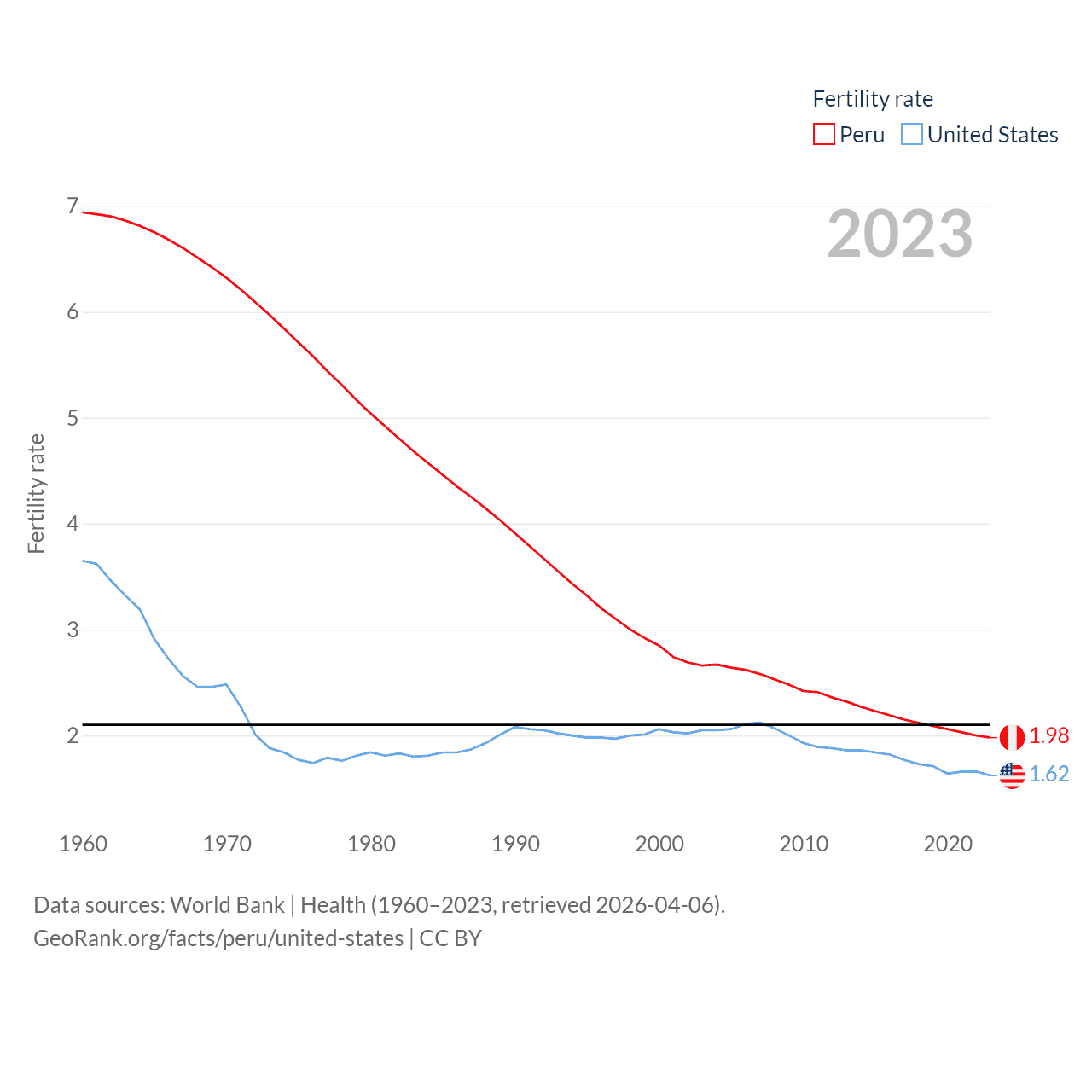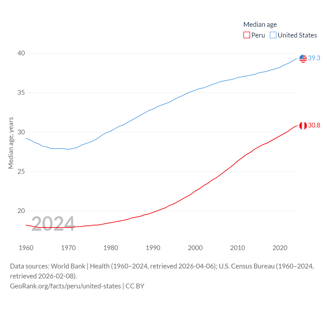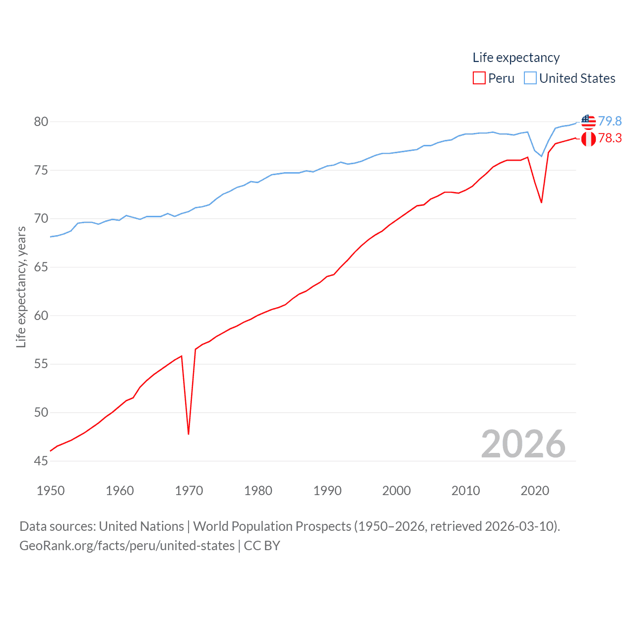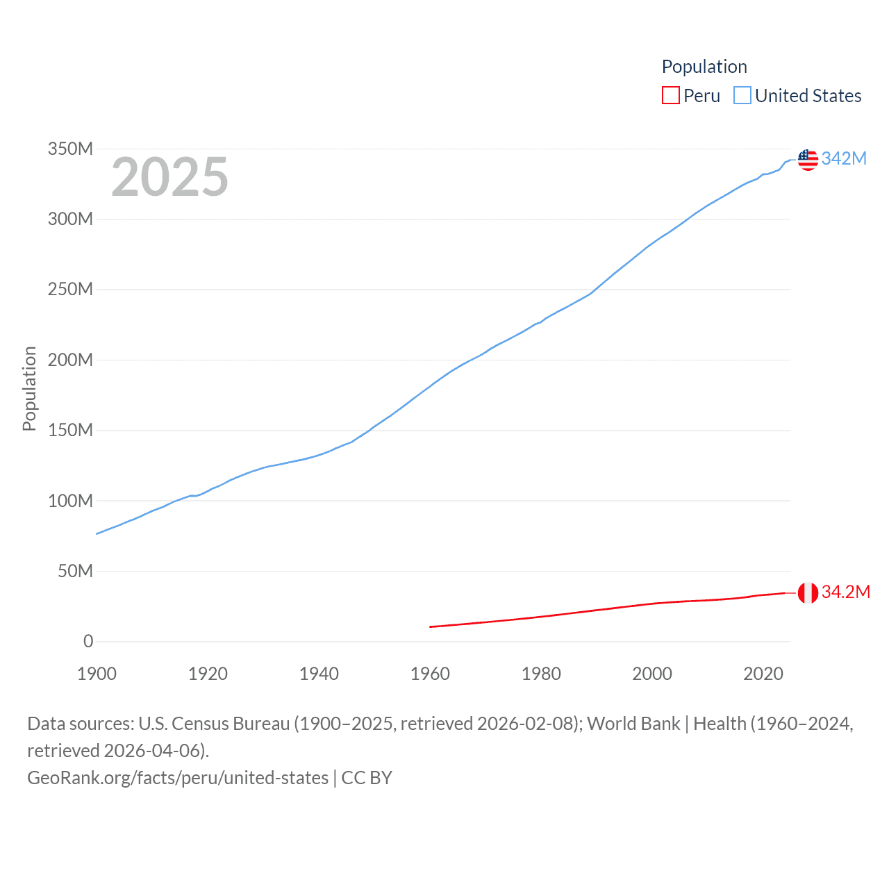 Peru has a population of 34.2M (ranked 48/197), compared with 342M in The United States (ranked 3/197). Peru's land area is 494,211 sq mi versus 3,531,839 sq mi for The United States (ranked 19th vs. 3rd).