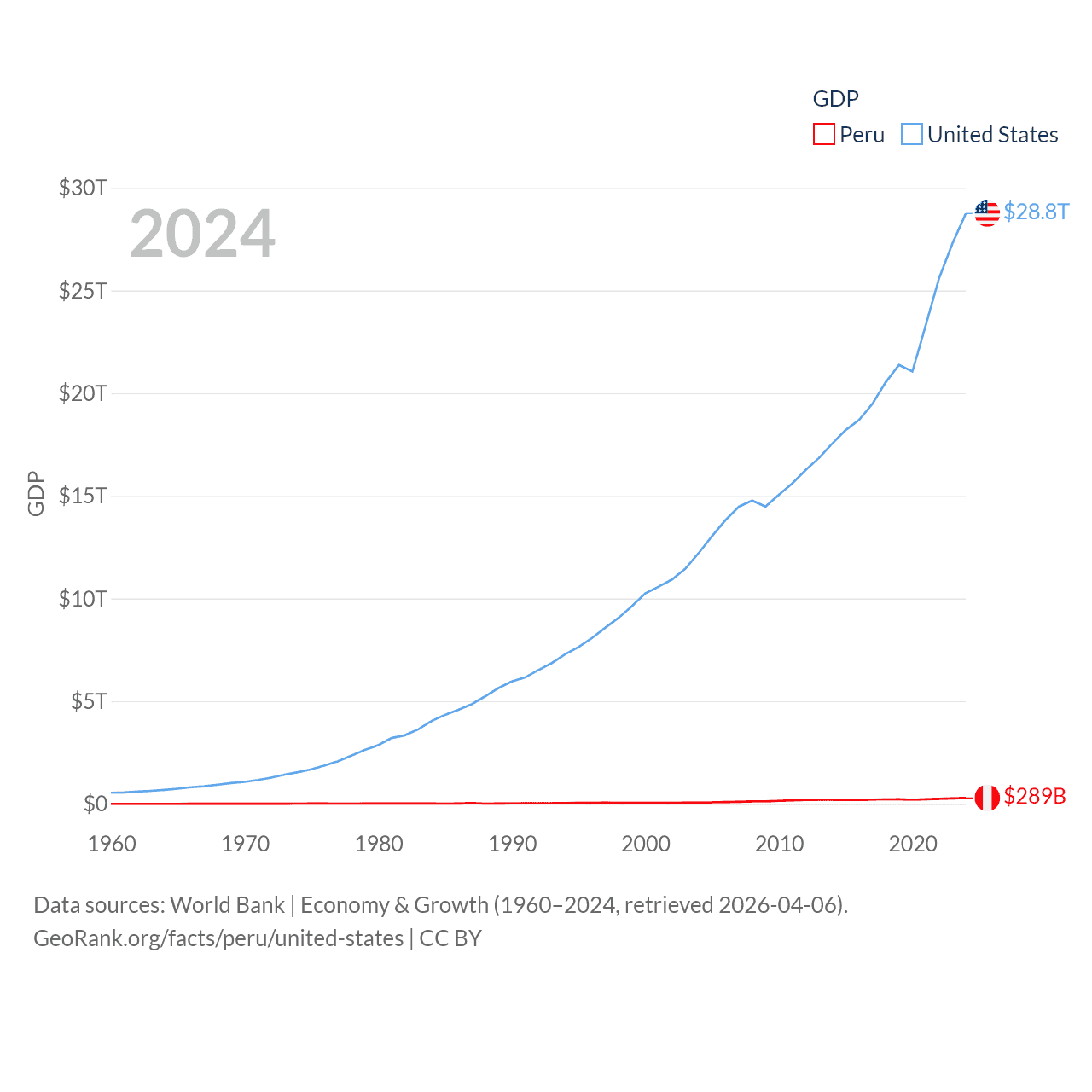 By GDP, Peru ranks 49/197 ($289B) and The United States ranks 1/197 ($28.8T). By GDP per capita, Peru ranks 91/197 ($8,452), while The United States ranks 10/197 ($84,534).
