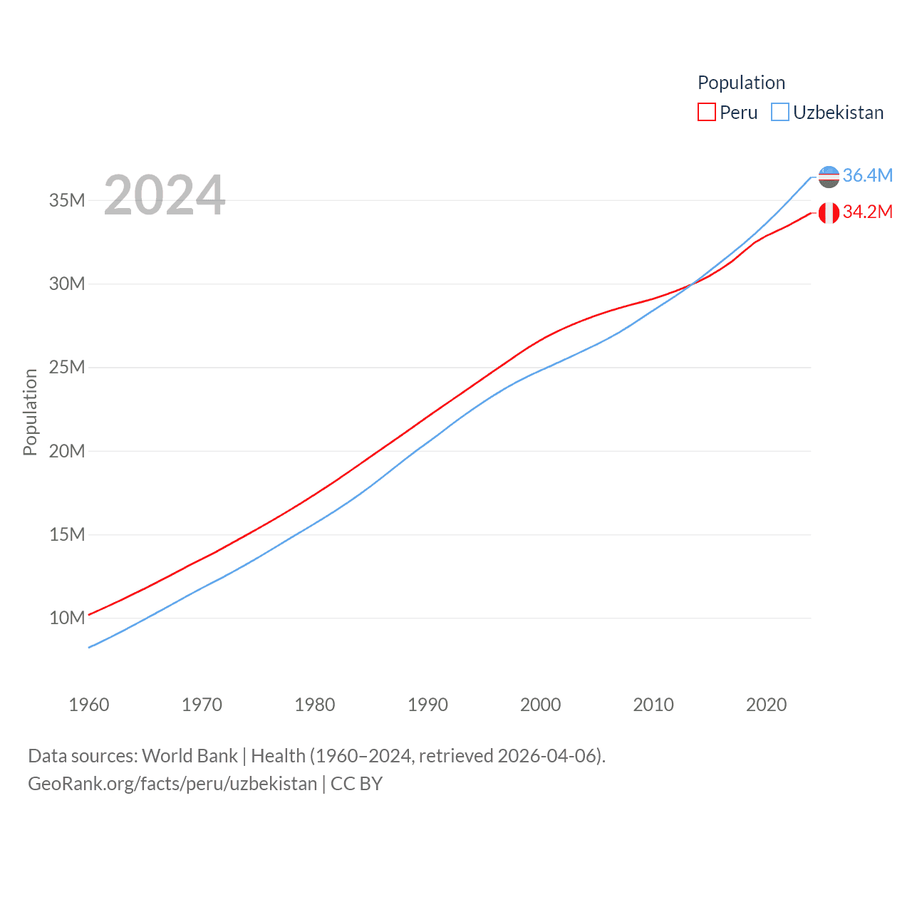 Peru has a population of 34.2M (ranked 48/197), compared with 36.4M in Uzbekistan (ranked 43/197). Peru's land area is 494,211 sq mi versus 170,136 sq mi for Uzbekistan (ranked 19th vs. 56th).