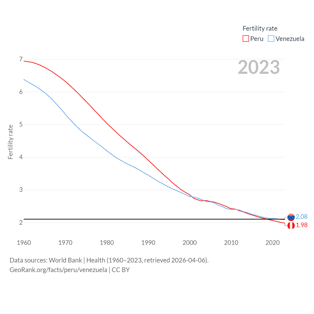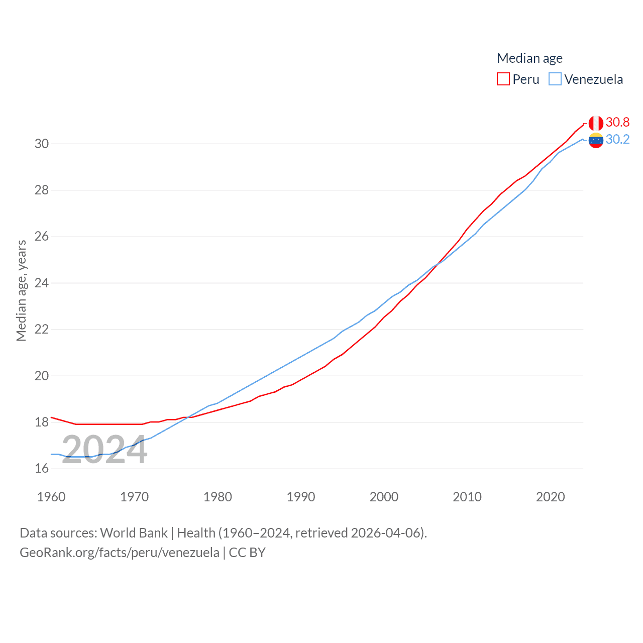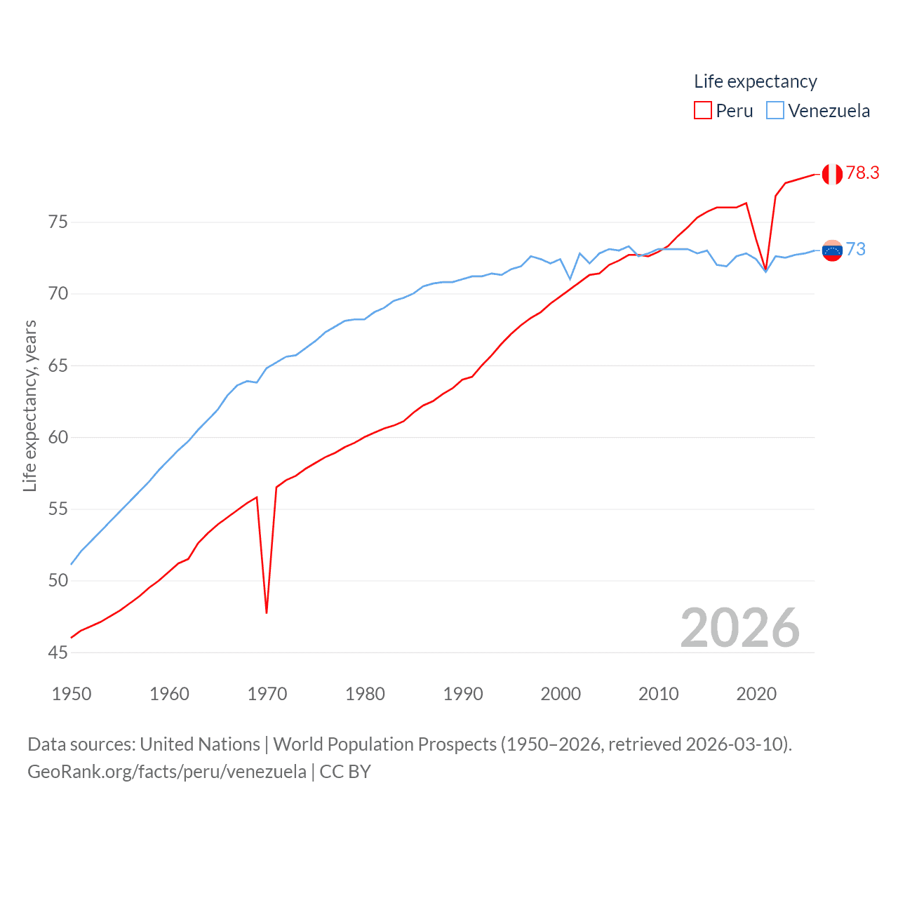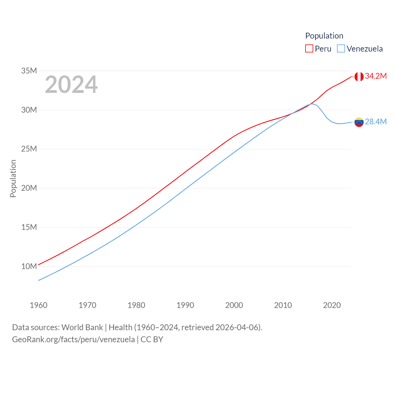 Peru has a population of 34.2M (ranked 48/197), compared with 28.4M in Venezuela (ranked 53/197). Peru's land area is 494,211 sq mi versus 340,561 sq mi for Venezuela (ranked 19th vs. 32nd).