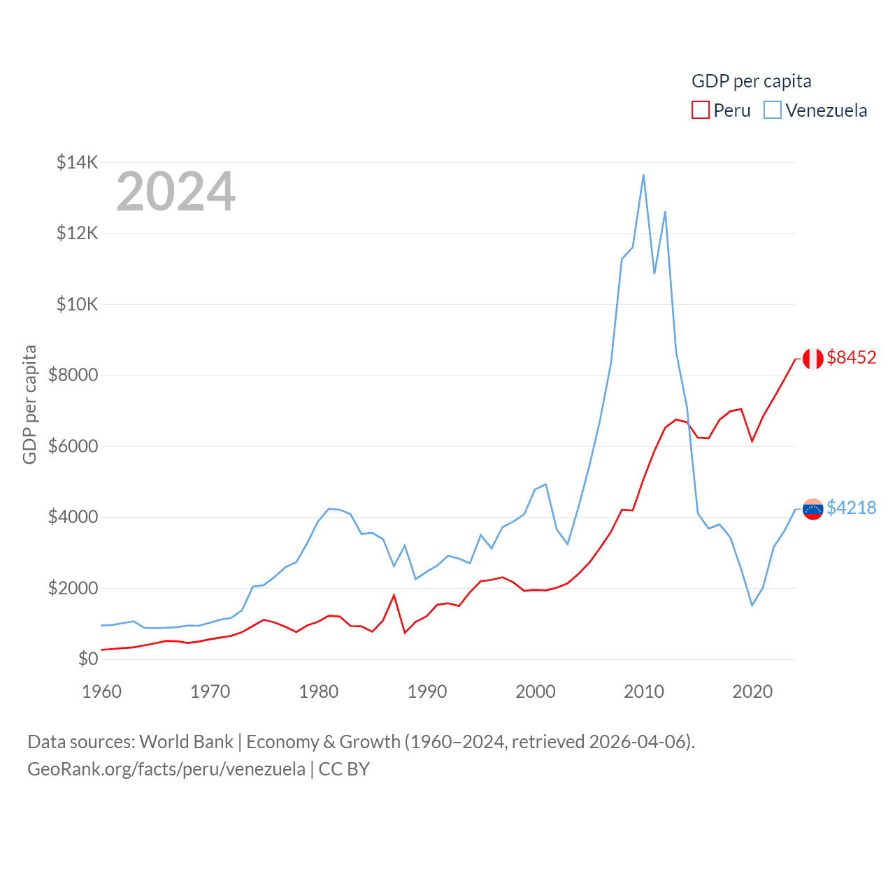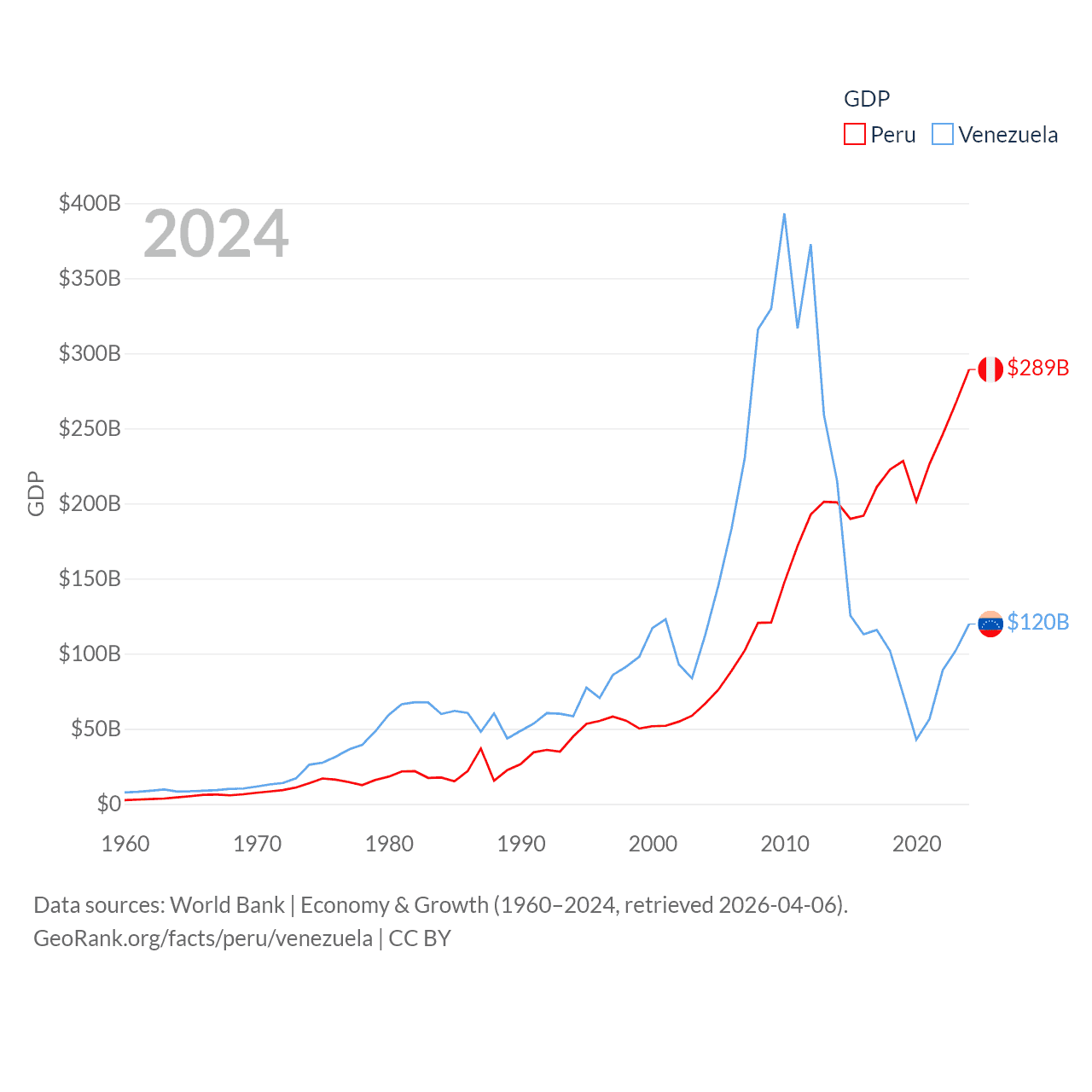 By GDP, Peru ranks 49/197 ($289B) and Venezuela ranks 65/197 ($120B). By GDP per capita, Peru ranks 91/197 ($8,452), while Venezuela ranks 128/197 ($4,218).