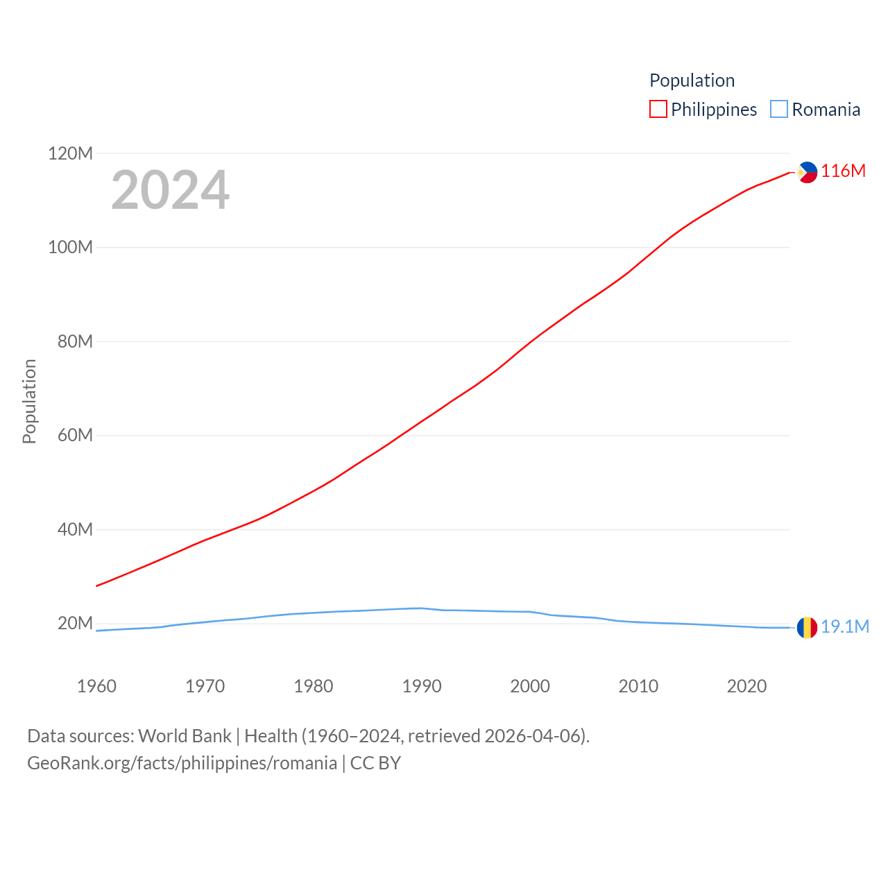The Philippines has a population of 116M (ranked 14/197), compared with 19.1M in Romania (ranked 67/197). The Philippines' land area is 115,124 sq mi versus 88,834 sq mi for Romania (ranked 71st vs. 80th).