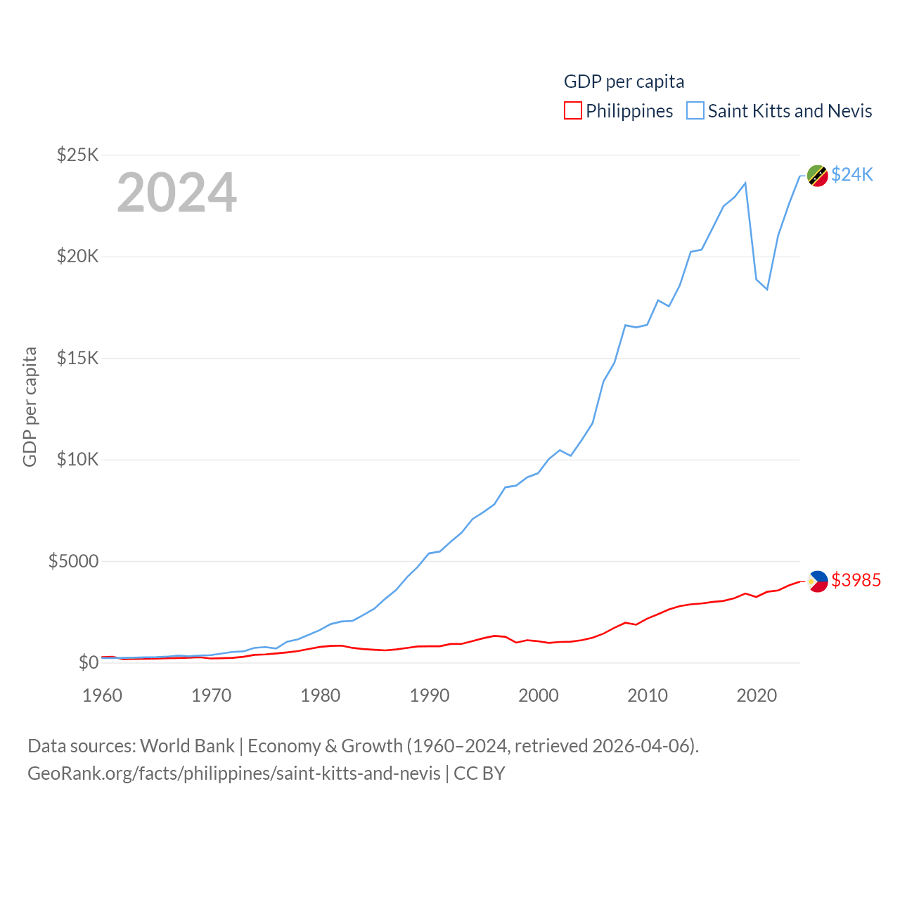 By GDP, The Philippines ranks 35/197 ($462B) and Saint Kitts and Nevis ranks 187/197 ($1.12B). By GDP per capita, The Philippines ranks 130/197 ($3,985), while Saint Kitts and Nevis ranks 51/197 ($23,961).