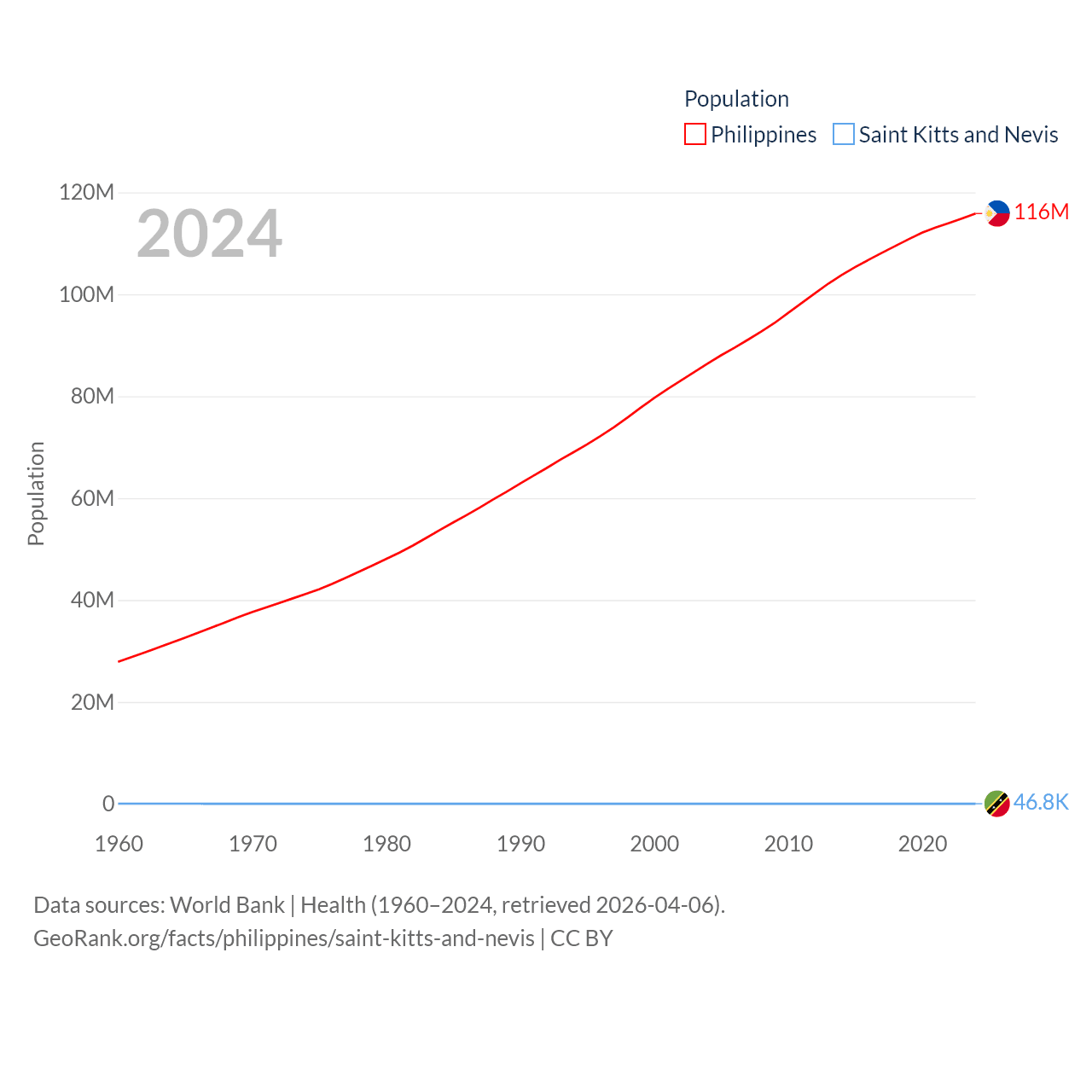 The Philippines has a population of 116M (ranked 14/197), compared with 46.8K in Saint Kitts and Nevis (ranked 189/197). The Philippines' land area is 115,124 sq mi versus 100.4 sq mi for Saint Kitts and Nevis (ranked 71st vs. 189th).