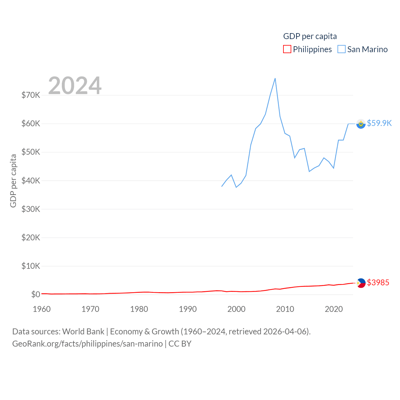 By GDP, The Philippines ranks 35/197 ($462B) and San Marino ranks 180/197 ($2.03B). By GDP per capita, The Philippines ranks 130/197 ($3,985), while San Marino ranks 15/197 ($59,880).