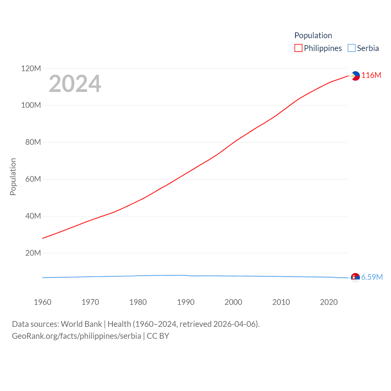 The Philippines has a population of 116M (ranked 14/197), compared with 6.59M in Serbia (ranked 109/197). The Philippines' land area is 115,124 sq mi versus 32,467 sq mi for Serbia (ranked 71st vs. 111th).