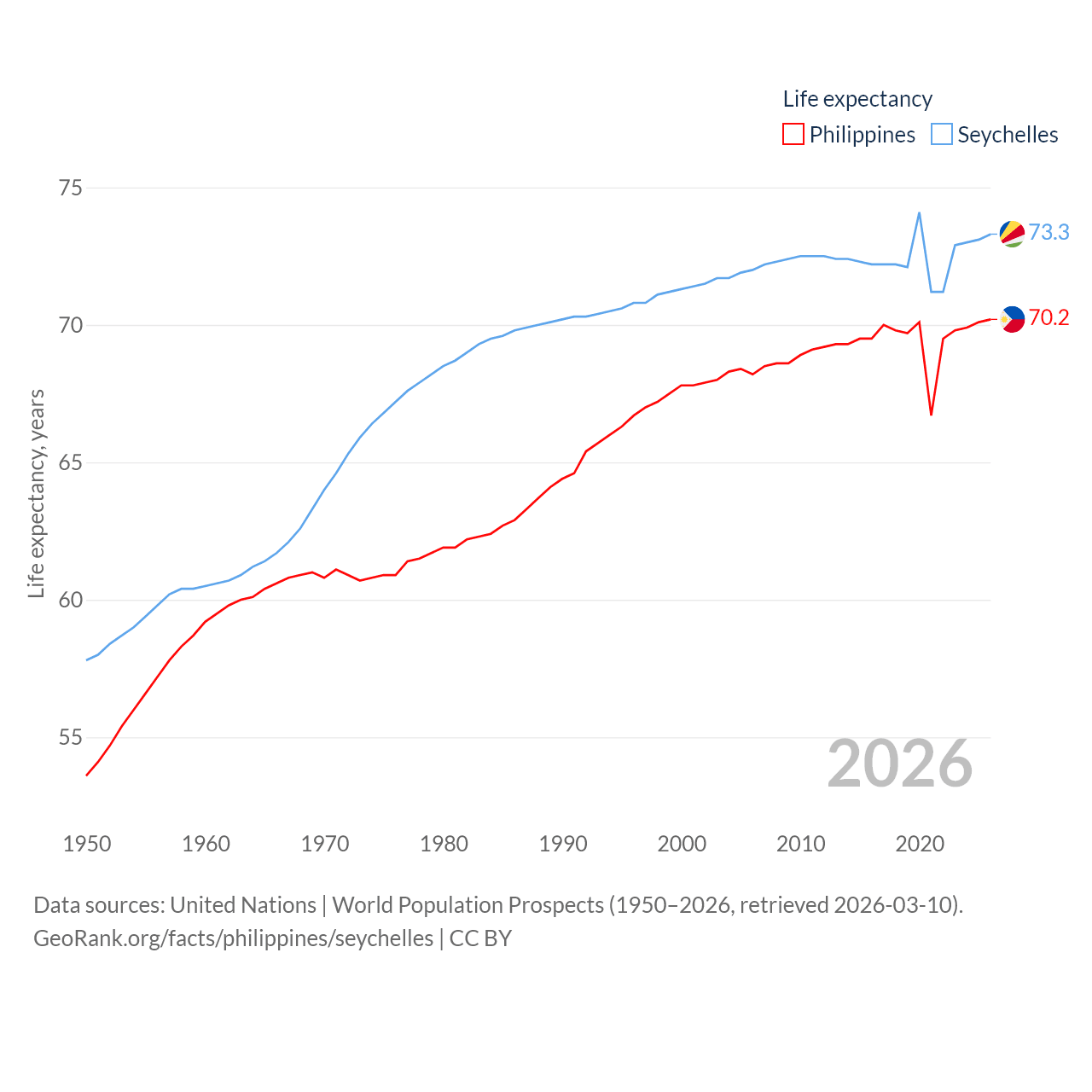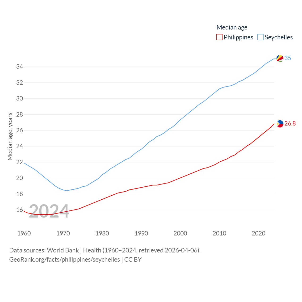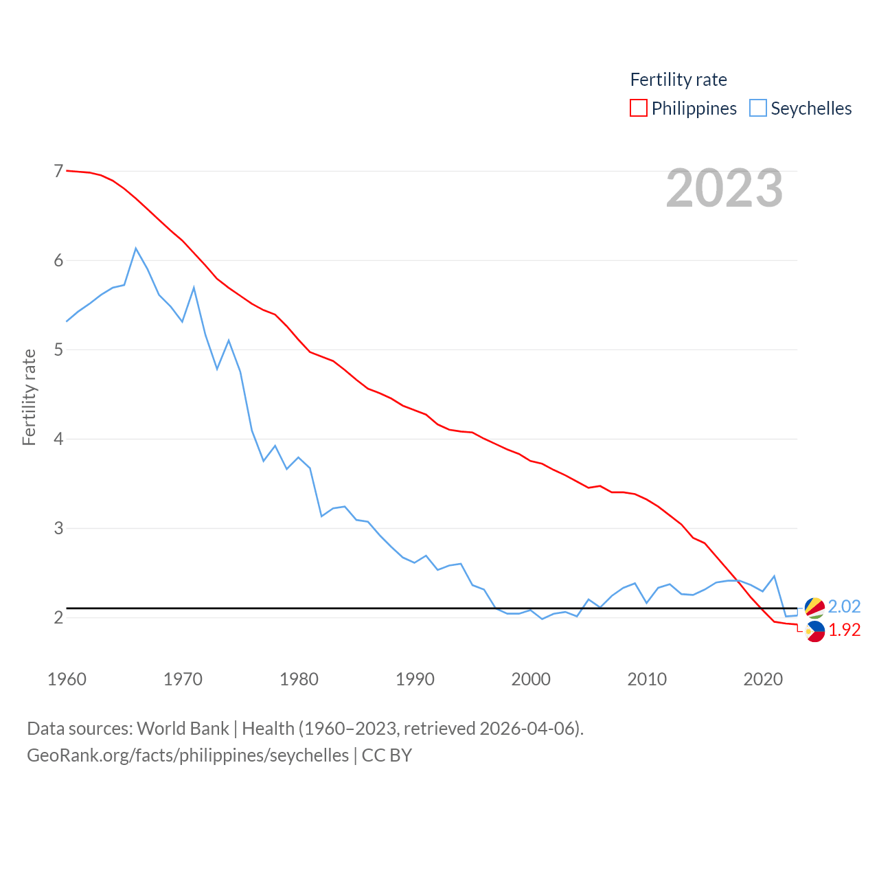 The Philippines has a population of 116M (ranked 14/197), compared with 121K in The Seychelles (ranked 181/197). The Philippines' land area is 115,124 sq mi versus 177.6 sq mi for The Seychelles (ranked 71st vs. 181st).