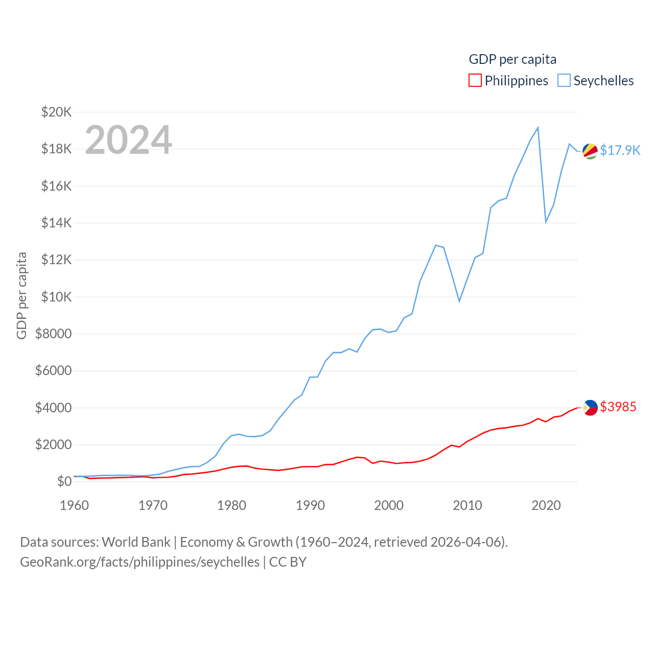 By GDP, The Philippines ranks 35/197 ($462B) and The Seychelles ranks 178/197 ($2.17B). By GDP per capita, The Philippines ranks 130/197 ($3,985), while The Seychelles ranks 63/197 ($17,859).