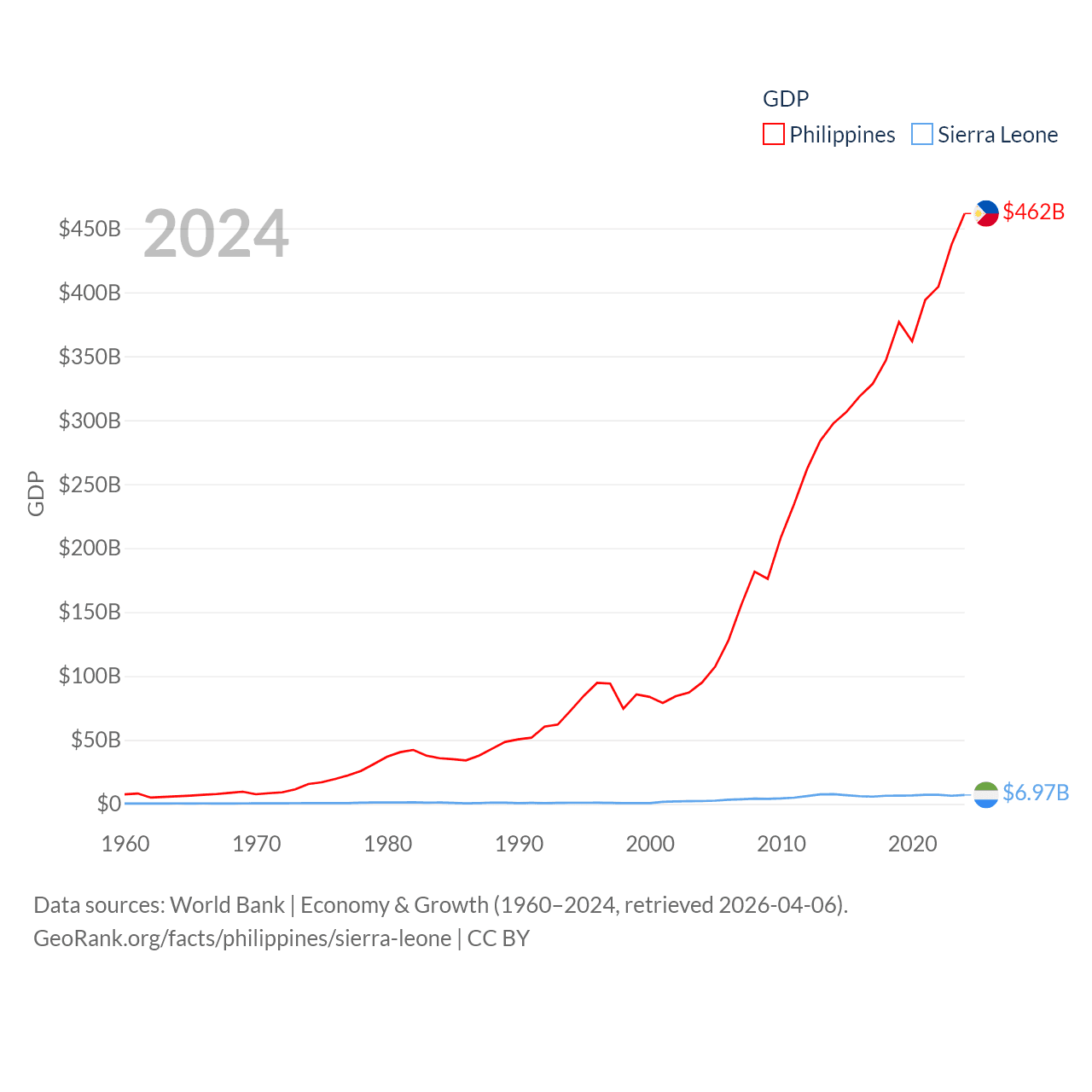 By GDP, The Philippines ranks 35/197 ($462B) and Sierra Leone ranks 160/197 ($6.97B). By GDP per capita, The Philippines ranks 130/197 ($3,985), while Sierra Leone ranks 186/197 ($807).