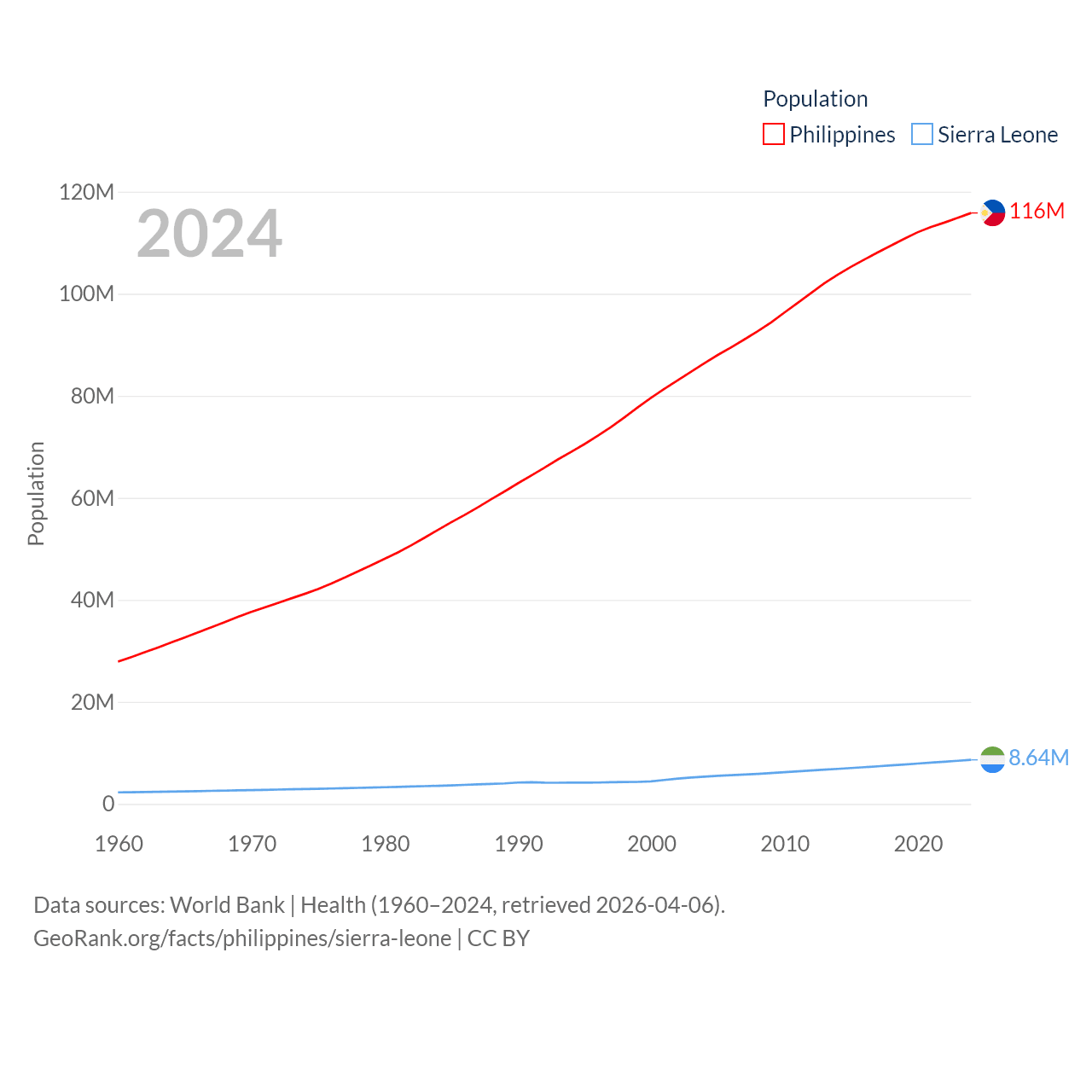 The Philippines has a population of 116M (ranked 14/197), compared with 8.64M in Sierra Leone (ranked 102/197). The Philippines' land area is 115,124 sq mi versus 27,869 sq mi for Sierra Leone (ranked 71st vs. 116th).