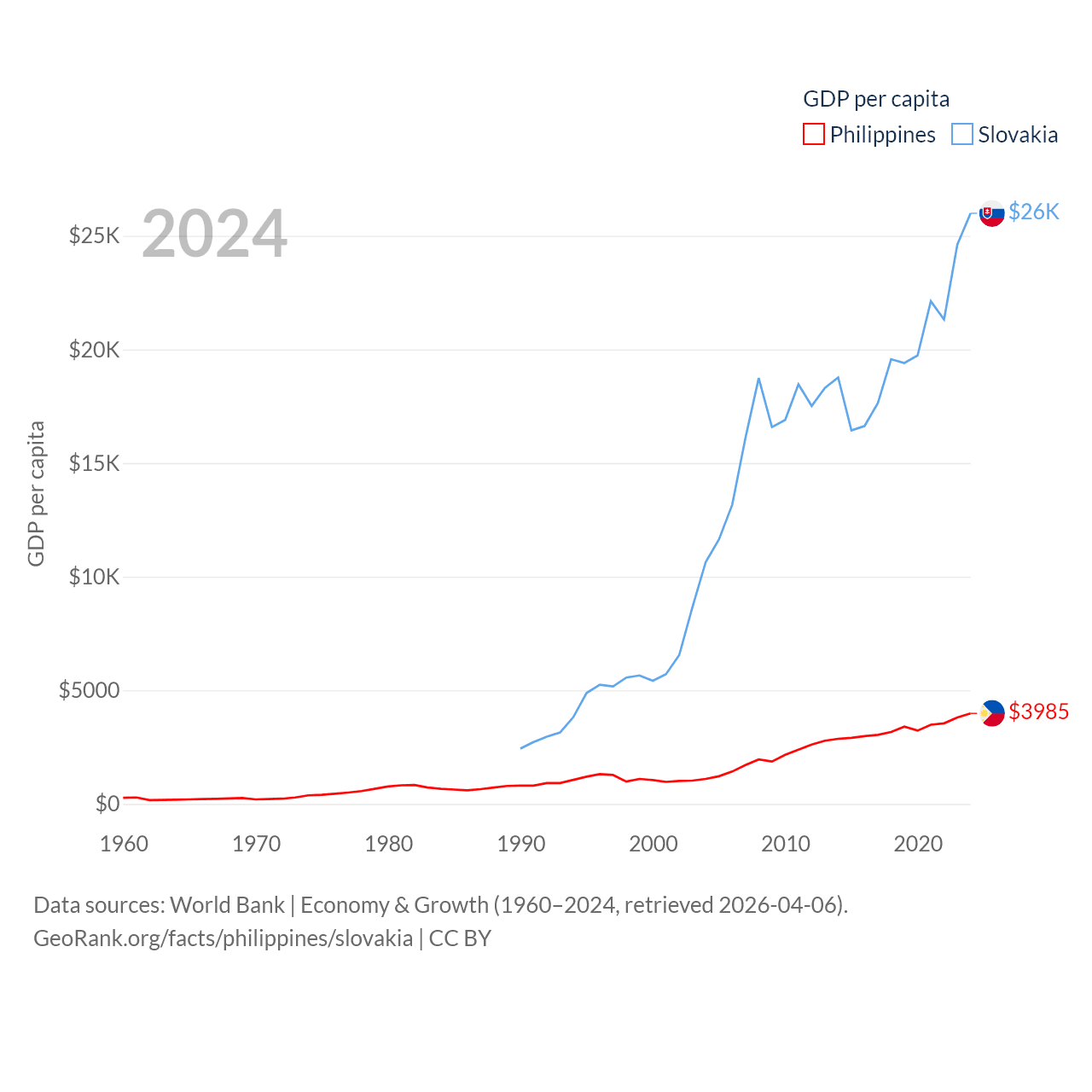By GDP, The Philippines ranks 35/197 ($462B) and Slovakia ranks 61/197 ($141B). By GDP per capita, The Philippines ranks 130/197 ($3,985), while Slovakia ranks 47/197 ($25,993).