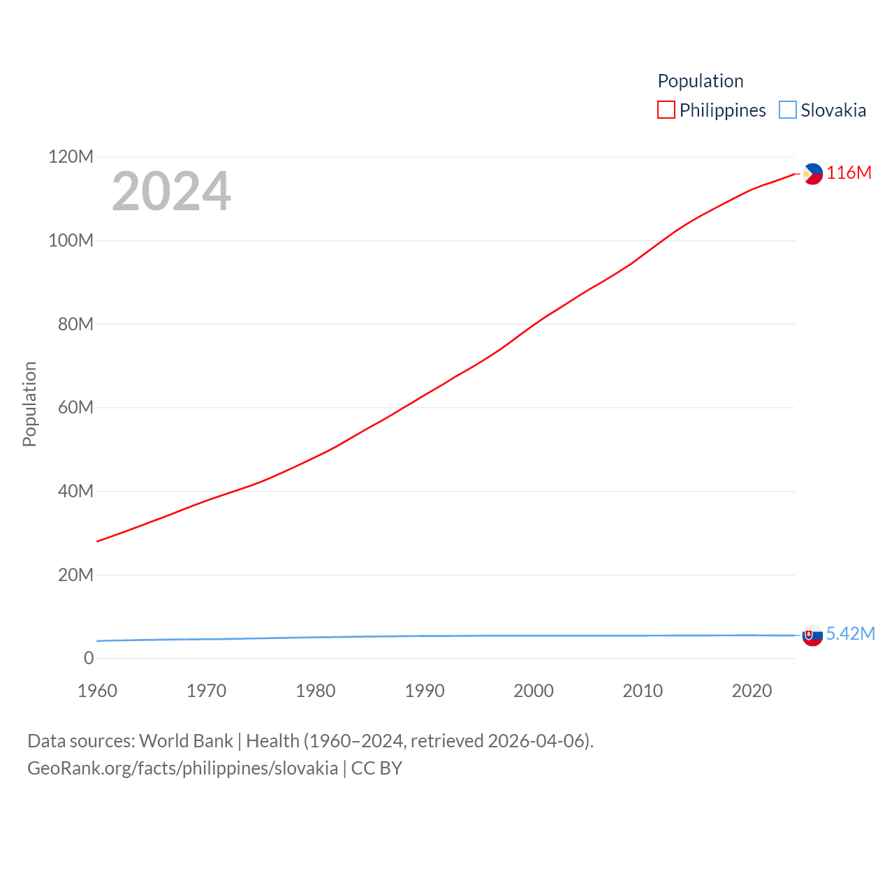 The Philippines has a population of 116M (ranked 14/197), compared with 5.42M in Slovakia (ranked 119/197). The Philippines' land area is 115,124 sq mi versus 18,564 sq mi for Slovakia (ranked 71st vs. 128th).