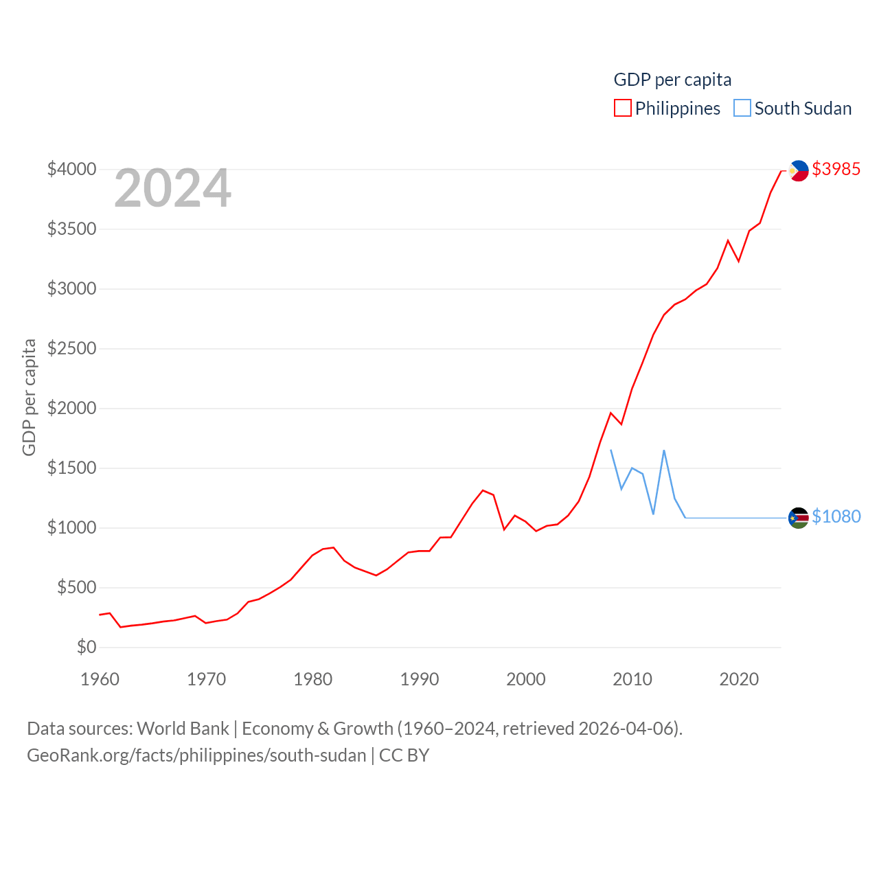 By GDP, The Philippines ranks 35/197 ($462B) and South Sudan ranks 149/197 ($12B). By GDP per capita, The Philippines ranks 130/197 ($3,985), while South Sudan ranks 175/197 ($1,080).
