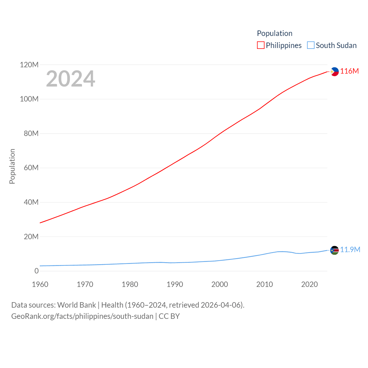 The Philippines has a population of 116M (ranked 14/197), compared with 11.9M in South Sudan (ranked 81/197). The Philippines' land area is 115,124 sq mi versus 243,990 sq mi for South Sudan (ranked 71st vs. 41st).