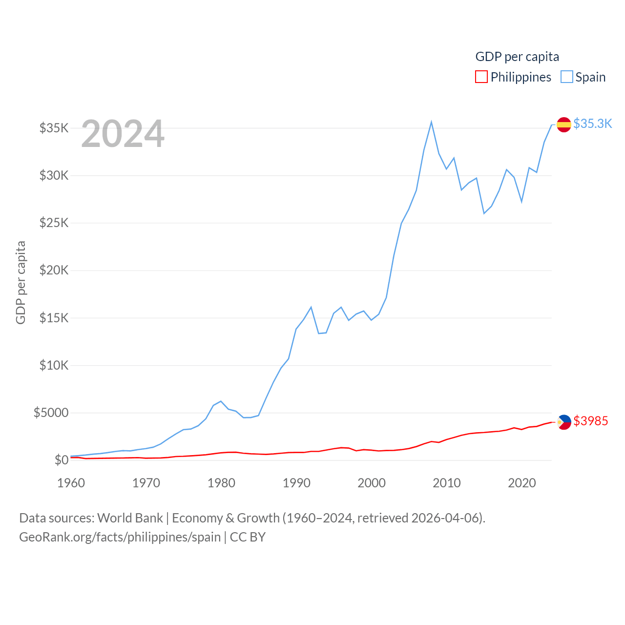 By GDP, The Philippines ranks 35/197 ($462B) and Spain ranks 15/197 ($1.73T). By GDP per capita, The Philippines ranks 130/197 ($3,985), while Spain ranks 32/197 ($35,327).