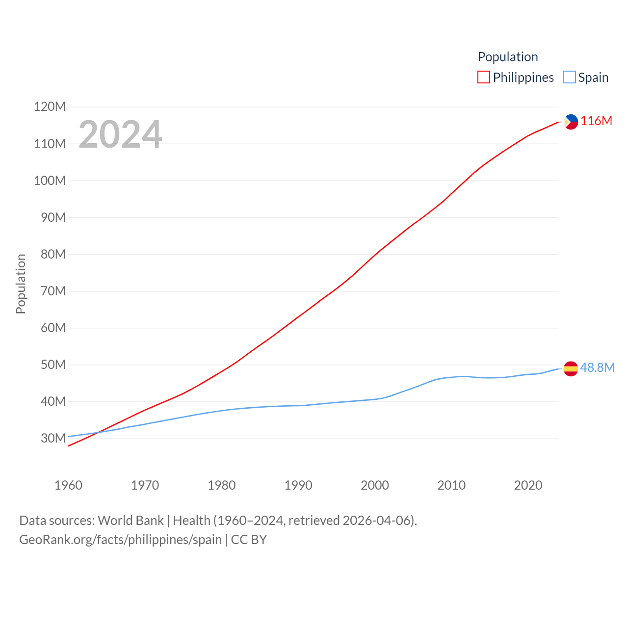 The Philippines has a population of 116M (ranked 14/197), compared with 48.8M in Spain (ranked 32/197). The Philippines' land area is 115,124 sq mi versus 192,934 sq mi for Spain (ranked 71st vs. 51st).
