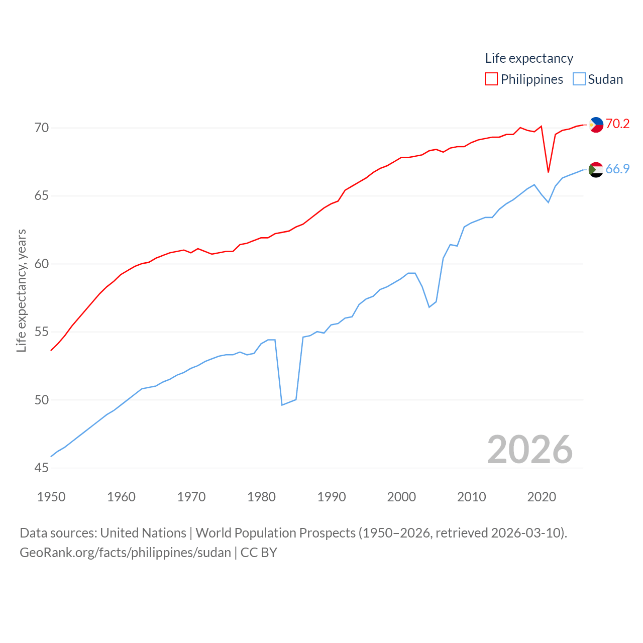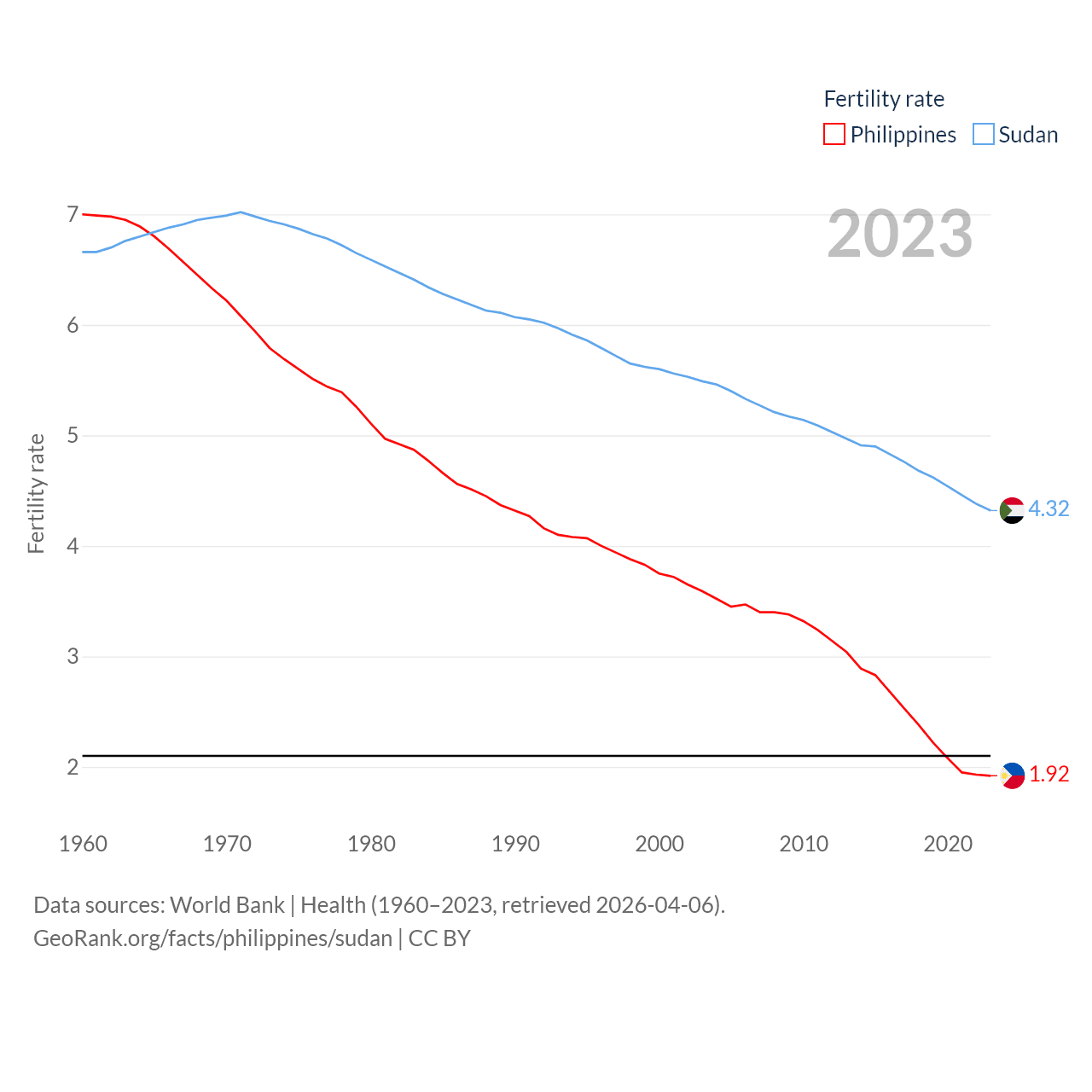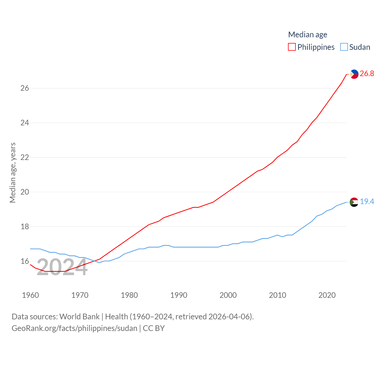 The Philippines has a population of 116M (ranked 14/197), compared with 50.4M in Sudan (ranked 30/197). The Philippines' land area is 115,124 sq mi versus 721,239 sq mi for Sudan (ranked 71st vs. 15th).