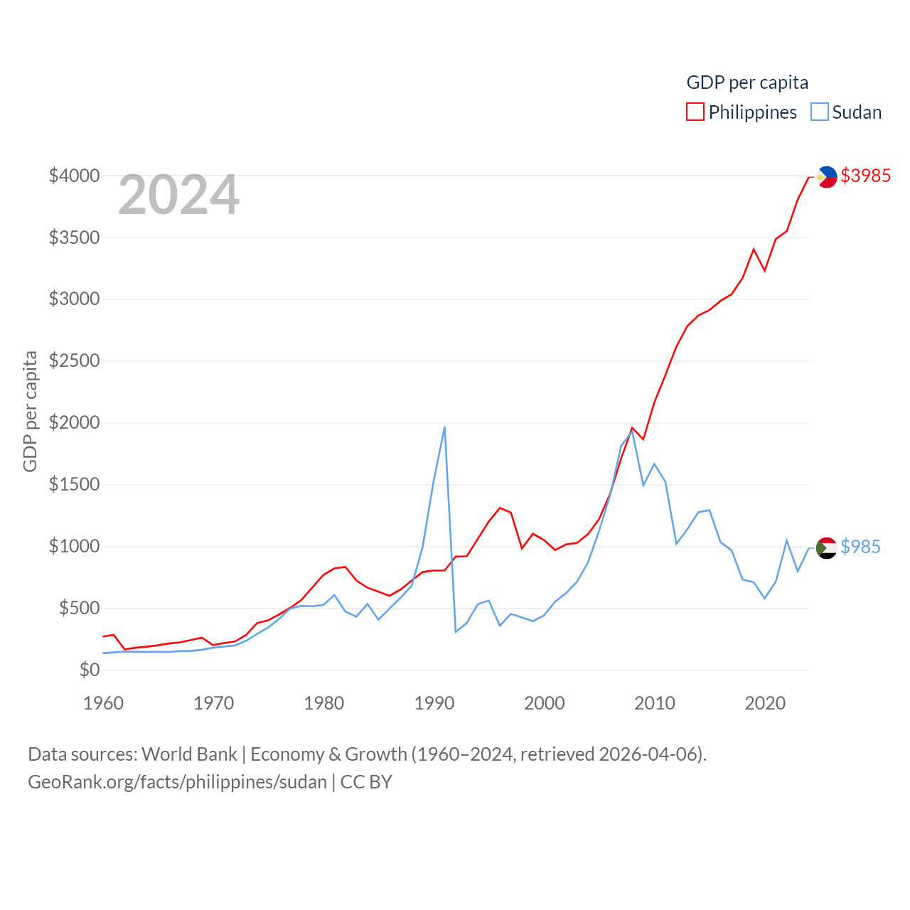 By GDP, The Philippines ranks 35/197 ($462B) and Sudan ranks 94/197 ($49.7B). By GDP per capita, The Philippines ranks 130/197 ($3,985), while Sudan ranks 179/197 ($985).