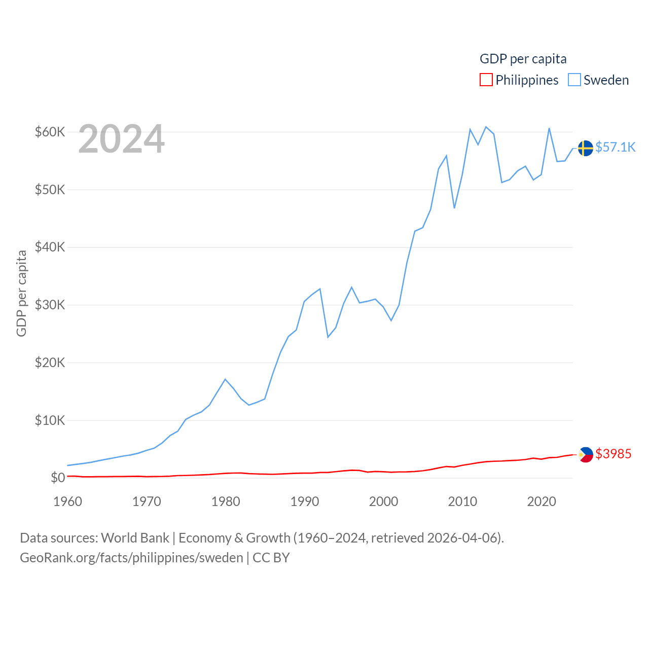 By GDP, The Philippines ranks 35/197 ($462B) and Sweden ranks 26/197 ($604B). By GDP per capita, The Philippines ranks 130/197 ($3,985), while Sweden ranks 17/197 ($57,117).