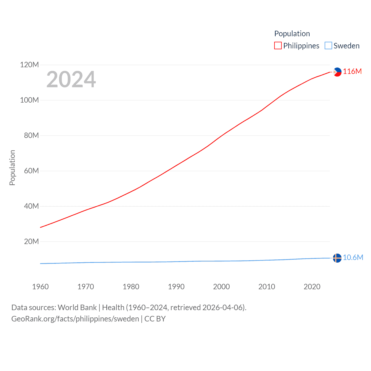 The Philippines has a population of 116M (ranked 14/197), compared with 10.6M in Sweden (ranked 93/197). The Philippines' land area is 115,124 sq mi versus 157,248 sq mi for Sweden (ranked 71st vs. 58th).