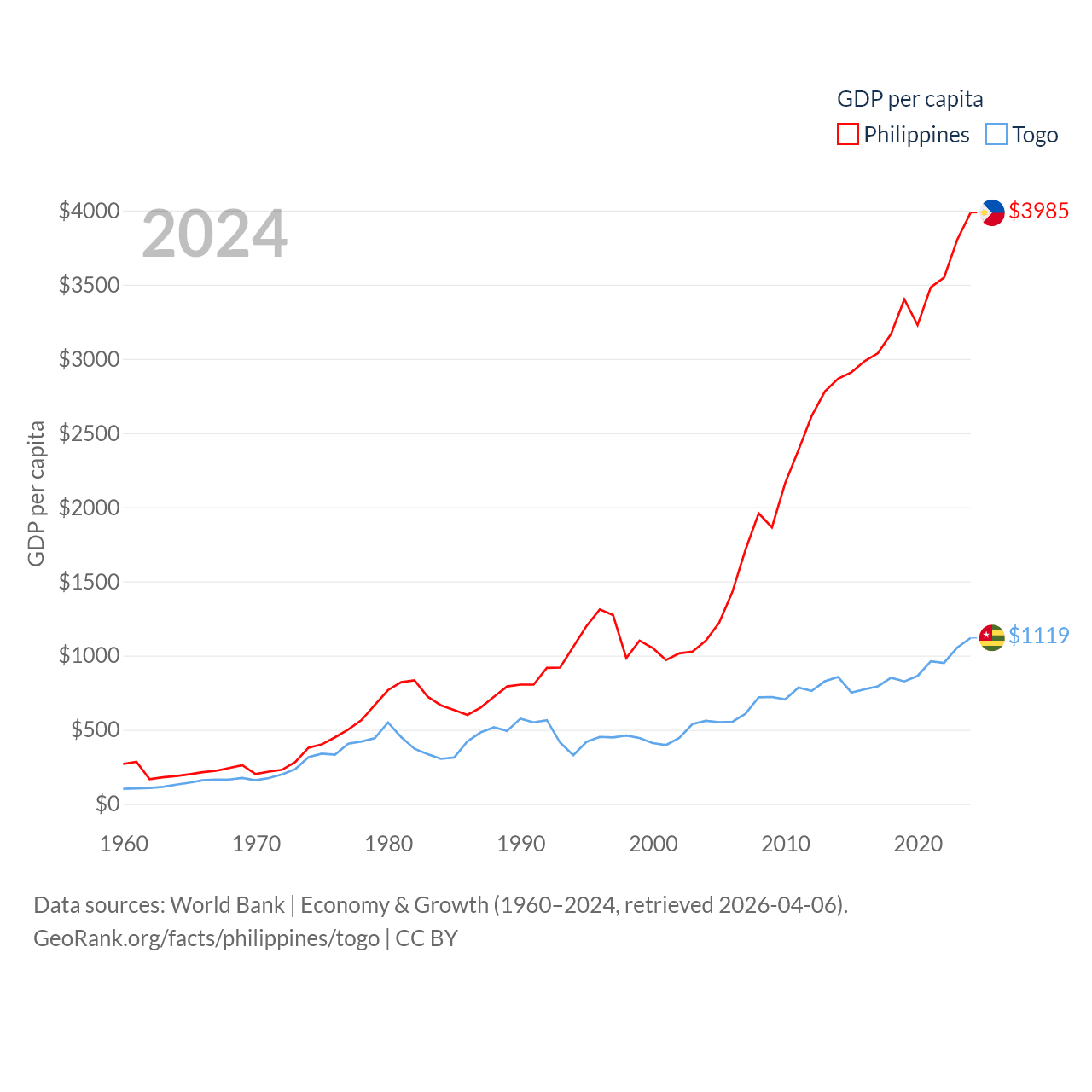 By GDP, The Philippines ranks 35/197 ($462B) and Togo ranks 154/197 ($10.7B). By GDP per capita, The Philippines ranks 130/197 ($3,985), while Togo ranks 172/197 ($1,119).