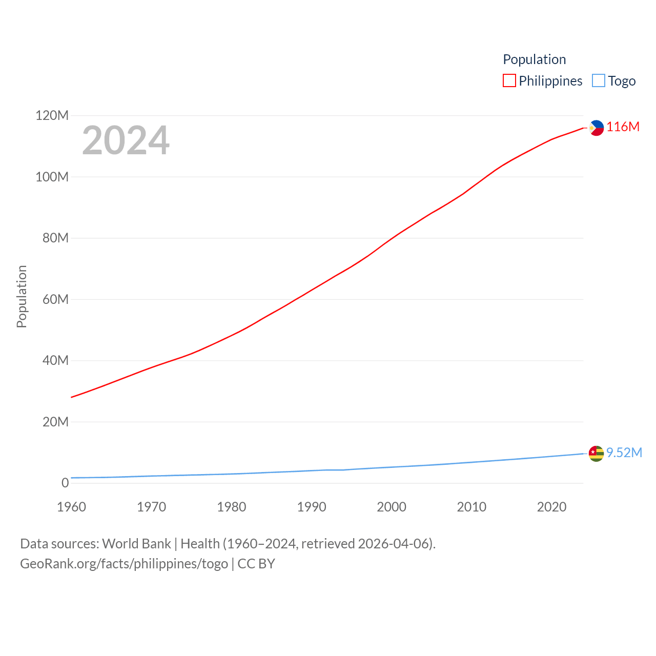 The Philippines has a population of 116M (ranked 14/197), compared with 9.52M in Togo (ranked 98/197). The Philippines' land area is 115,124 sq mi versus 21,000 sq mi for Togo (ranked 71st vs. 124th).