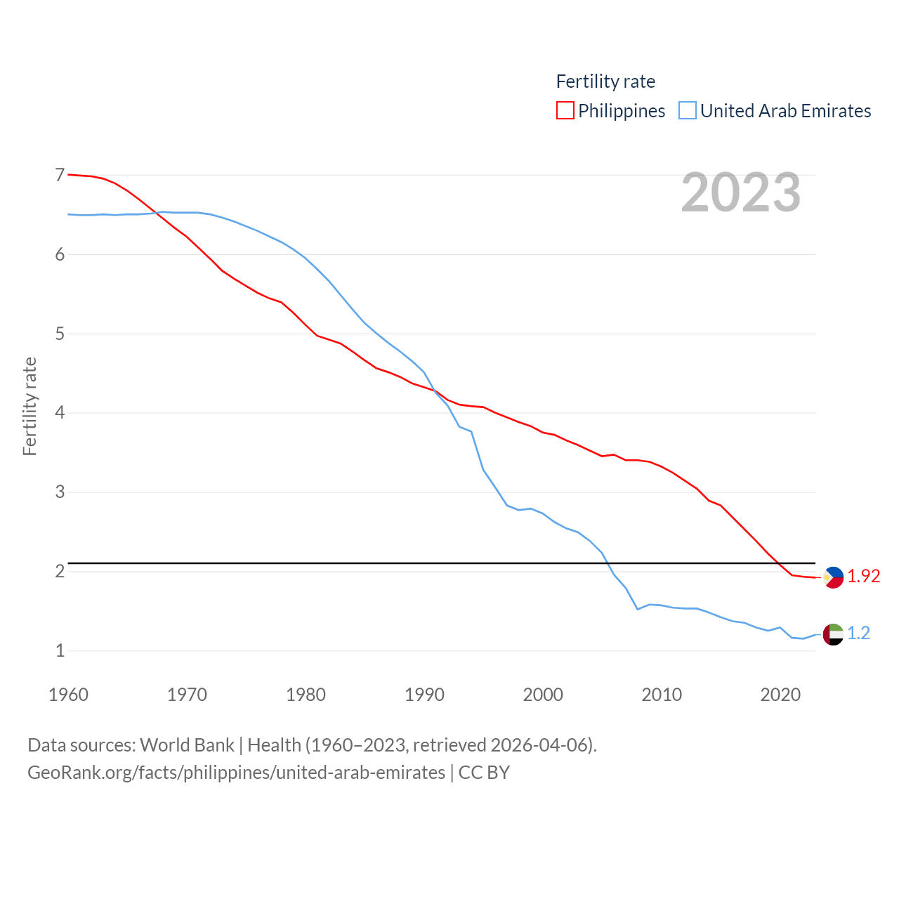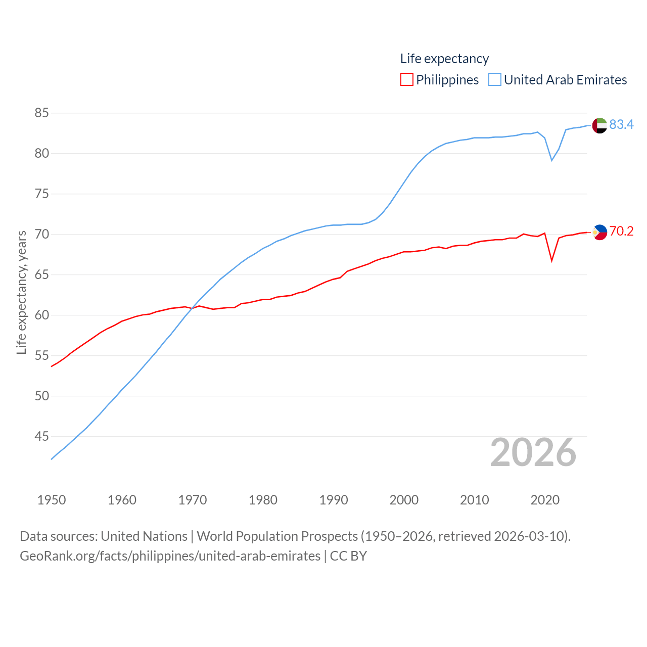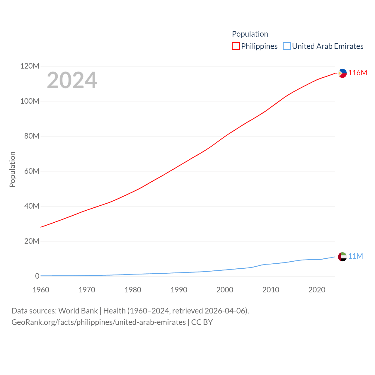 The Philippines has a population of 116M (ranked 14/197), compared with 11M in The United Arab Emirates (ranked 86/197). The Philippines' land area is 115,124 sq mi versus 27,421 sq mi for The United Arab Emirates (ranked 71st vs. 117th).