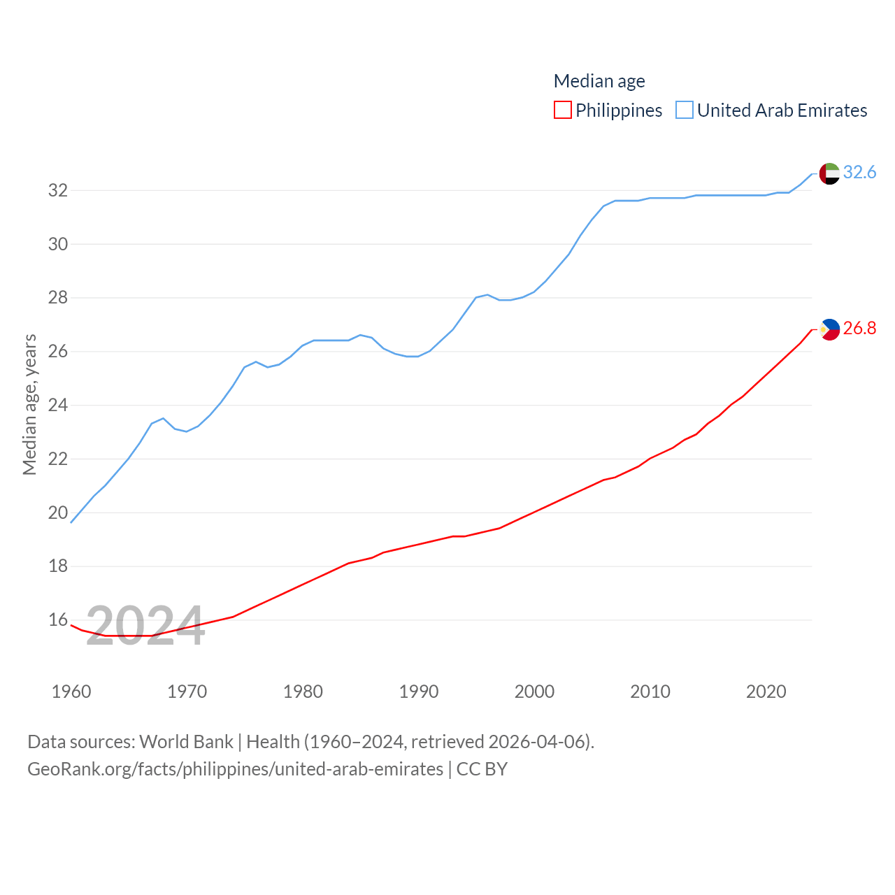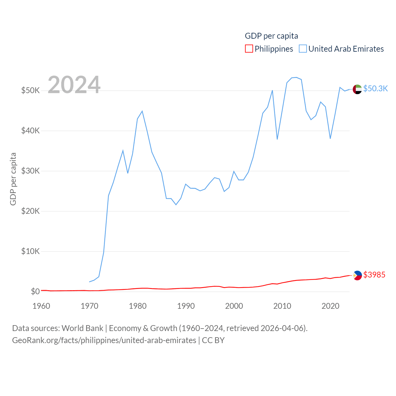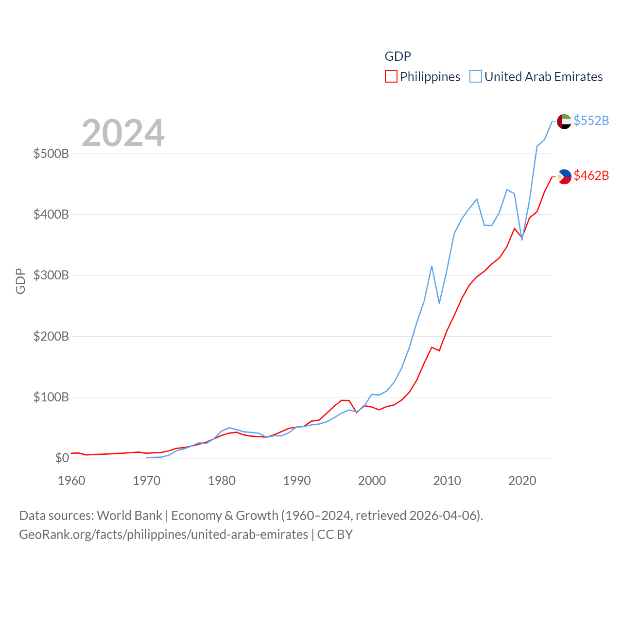 By GDP, The Philippines ranks 35/197 ($462B) and The United Arab Emirates ranks 27/197 ($552B). By GDP per capita, The Philippines ranks 130/197 ($3,985), while The United Arab Emirates ranks 24/197 ($50,274).