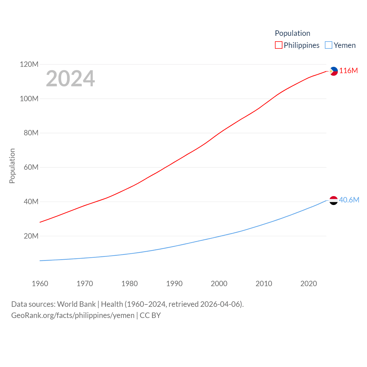 The Philippines has a population of 116M (ranked 14/197), compared with 40.6M in Yemen (ranked 38/197). The Philippines' land area is 115,124 sq mi versus 203,850 sq mi for Yemen (ranked 71st vs. 49th).