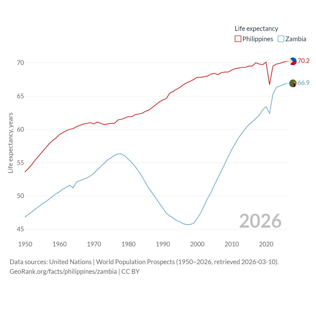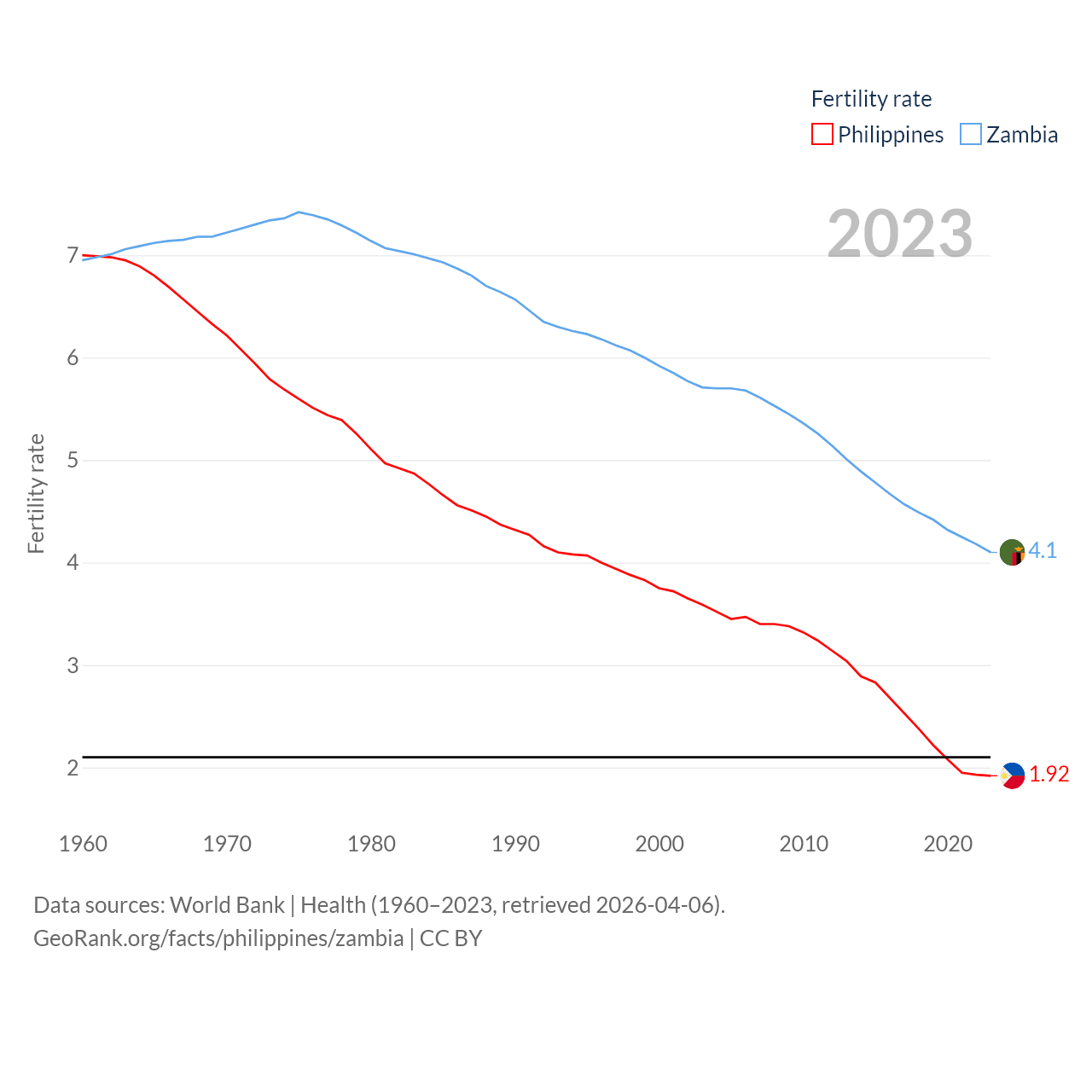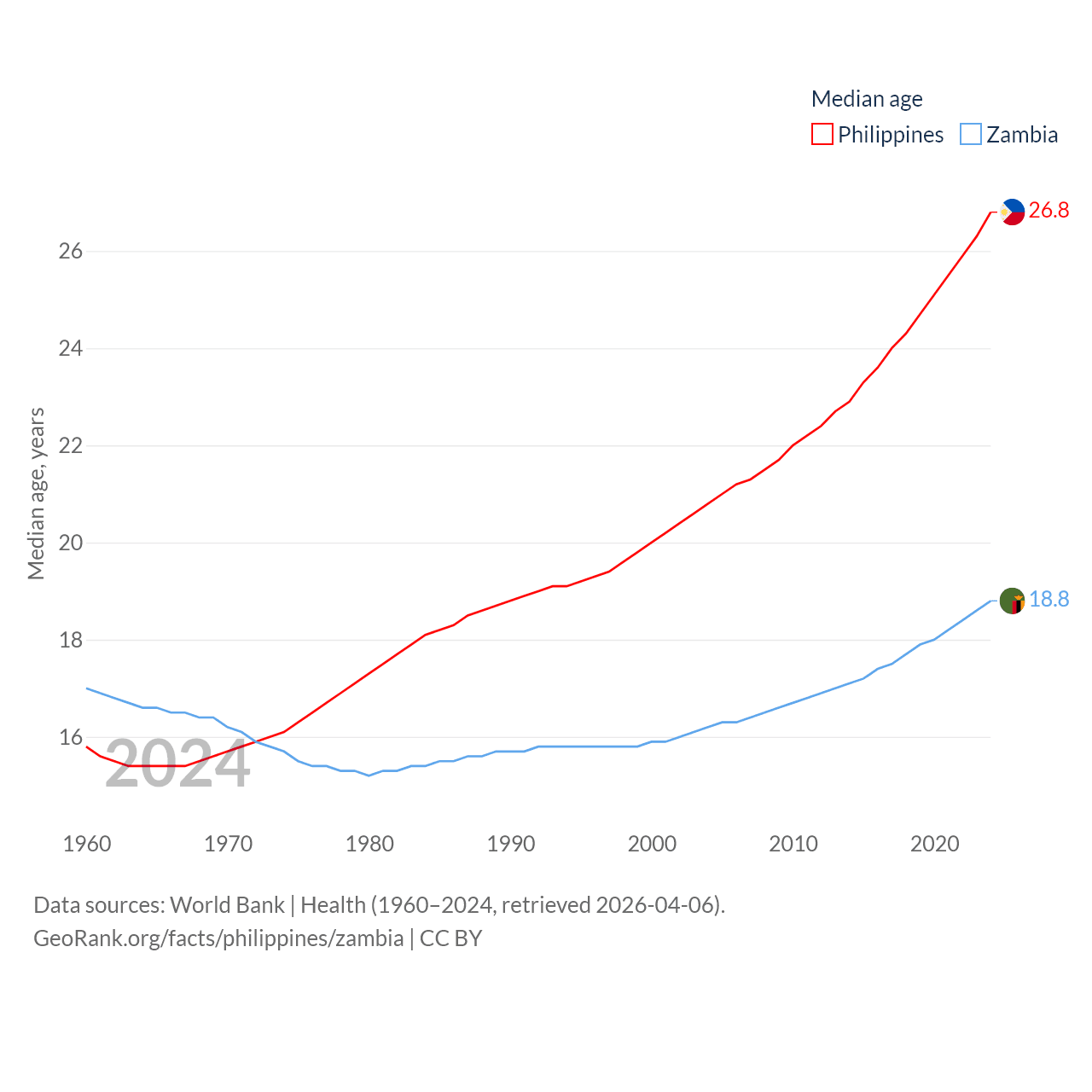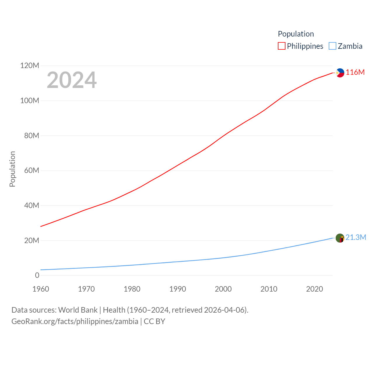 The Philippines has a population of 116M (ranked 14/197), compared with 21.3M in Zambia (ranked 63/197). The Philippines' land area is 115,124 sq mi versus 287,024 sq mi for Zambia (ranked 71st vs. 37th).