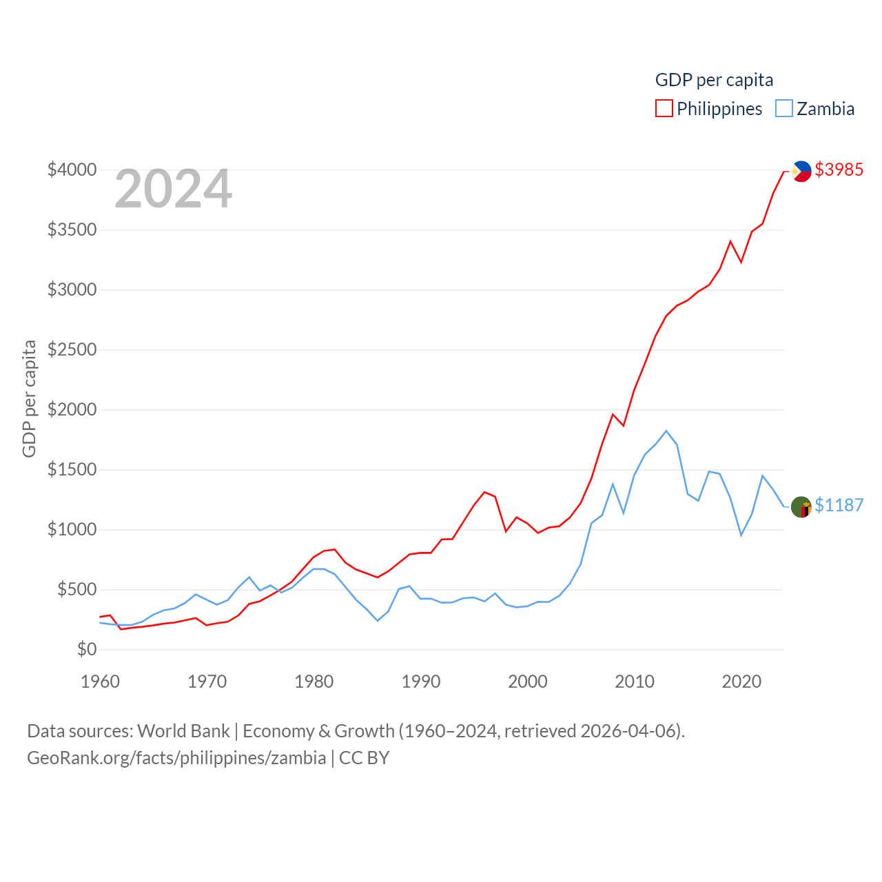 By GDP, The Philippines ranks 35/197 ($462B) and Zambia ranks 116/197 ($25.3B). By GDP per capita, The Philippines ranks 130/197 ($3,985), while Zambia ranks 169/197 ($1,187).