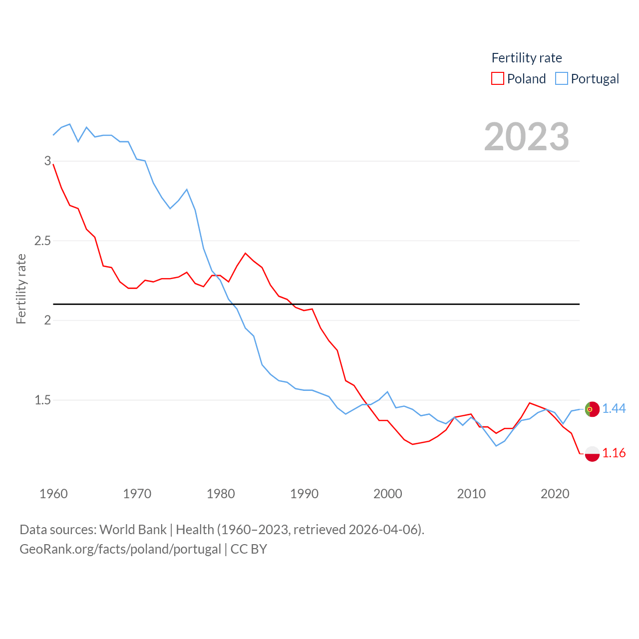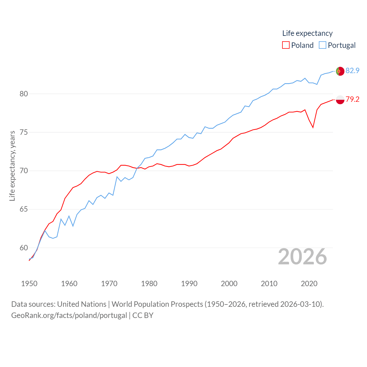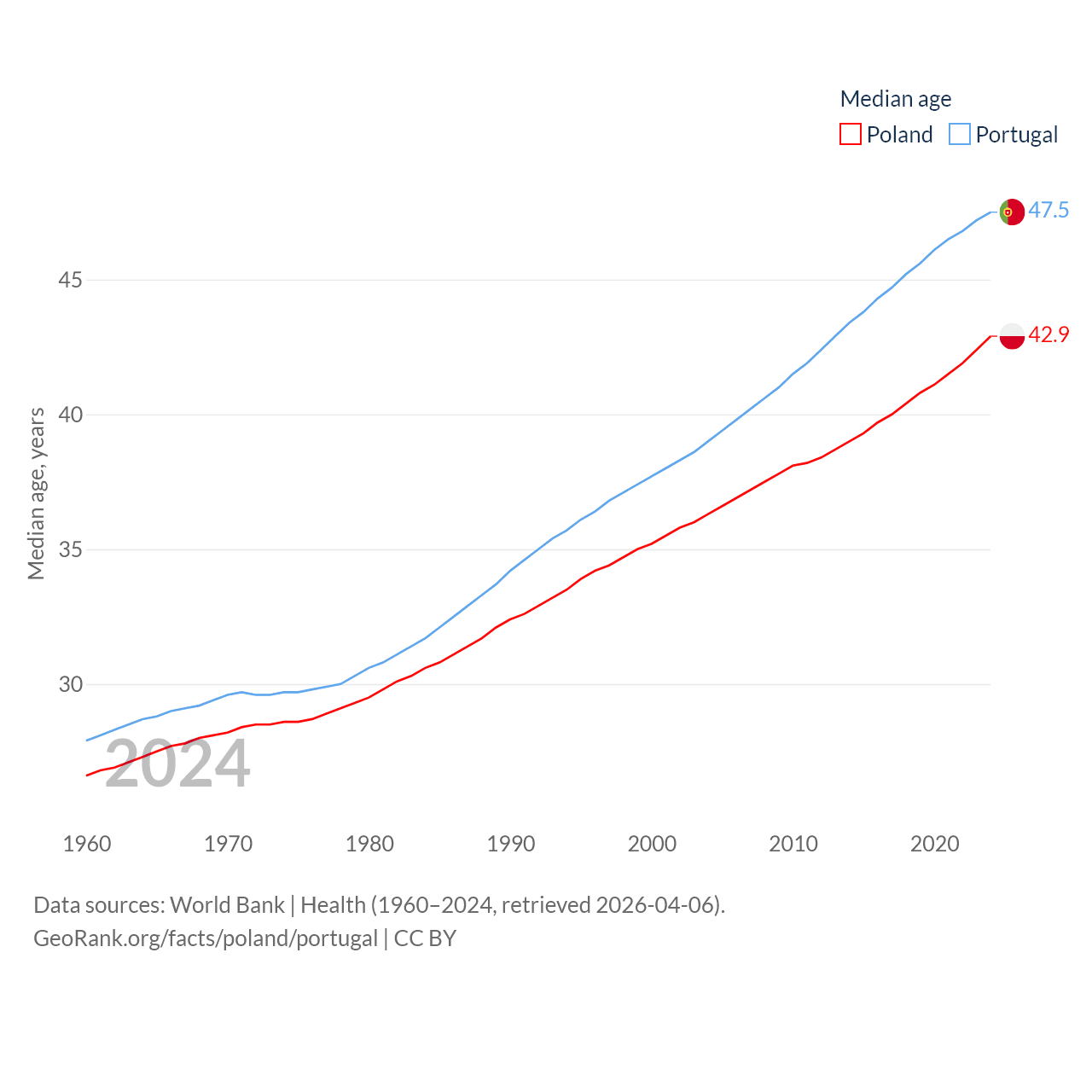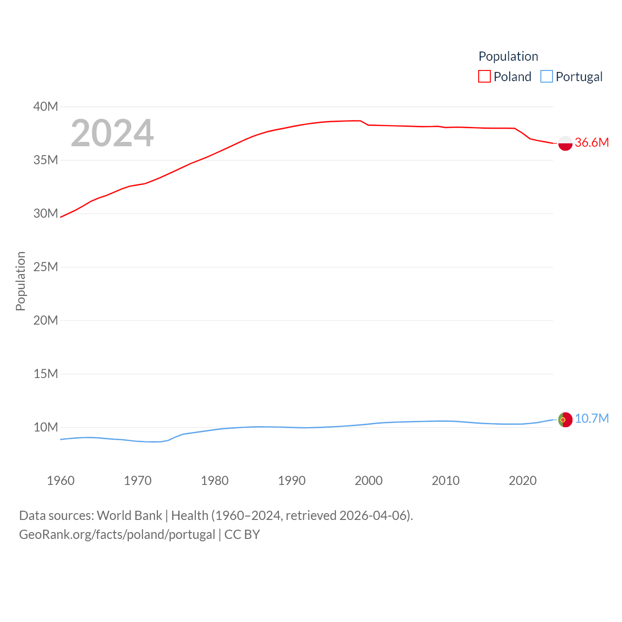 Poland has a population of 36.6M (ranked 42/197), compared with 10.7M in Portugal (ranked 90/197). Poland's land area is 118,252 sq mi versus 35,369 sq mi for Portugal (ranked 69th vs. 108th).