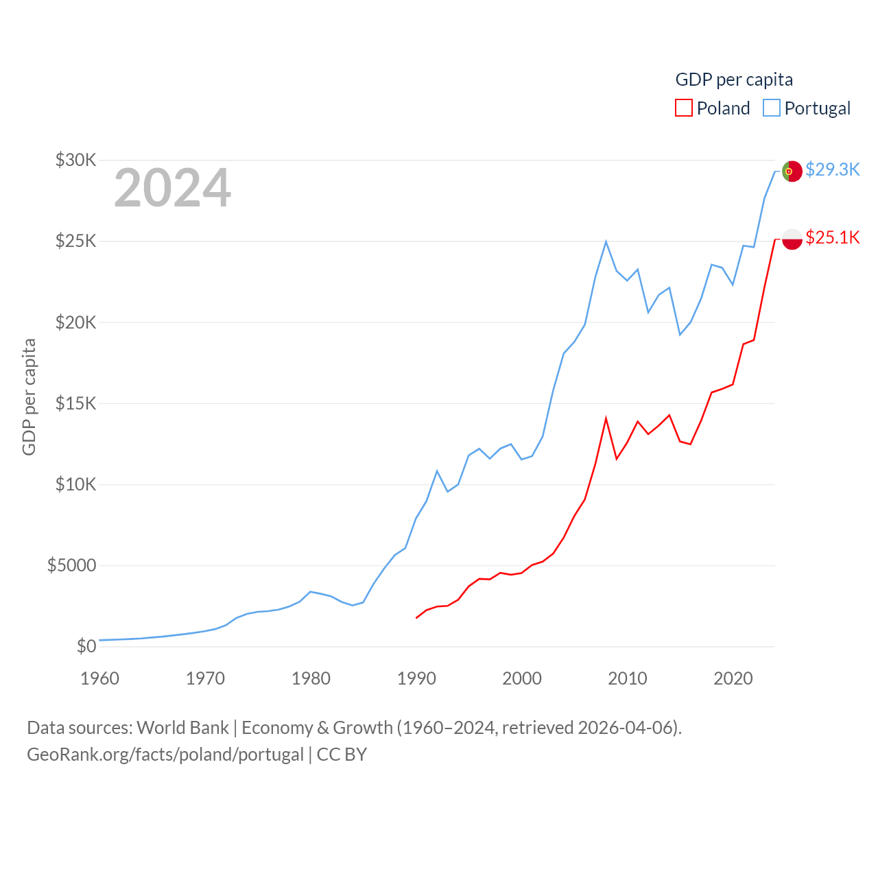 By GDP, Poland ranks 21/197 ($918B) and Portugal ranks 46/197 ($313B). By GDP per capita, Poland ranks 48/197 ($25,104), while Portugal ranks 44/197 ($29,292).