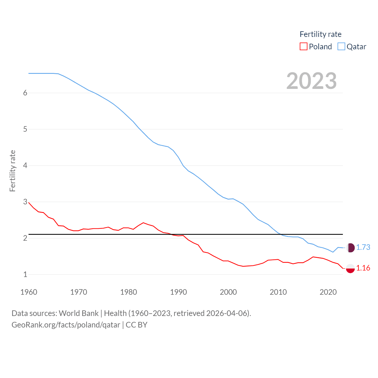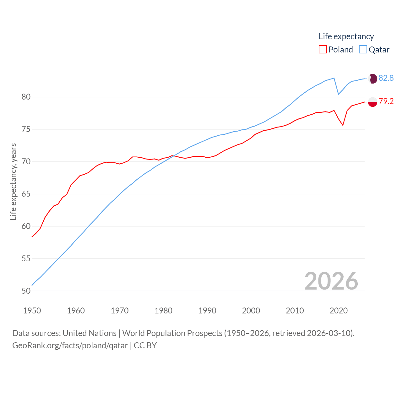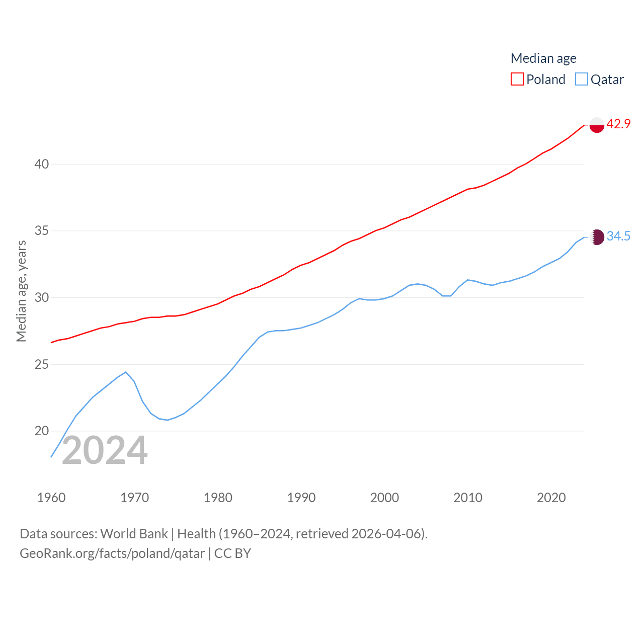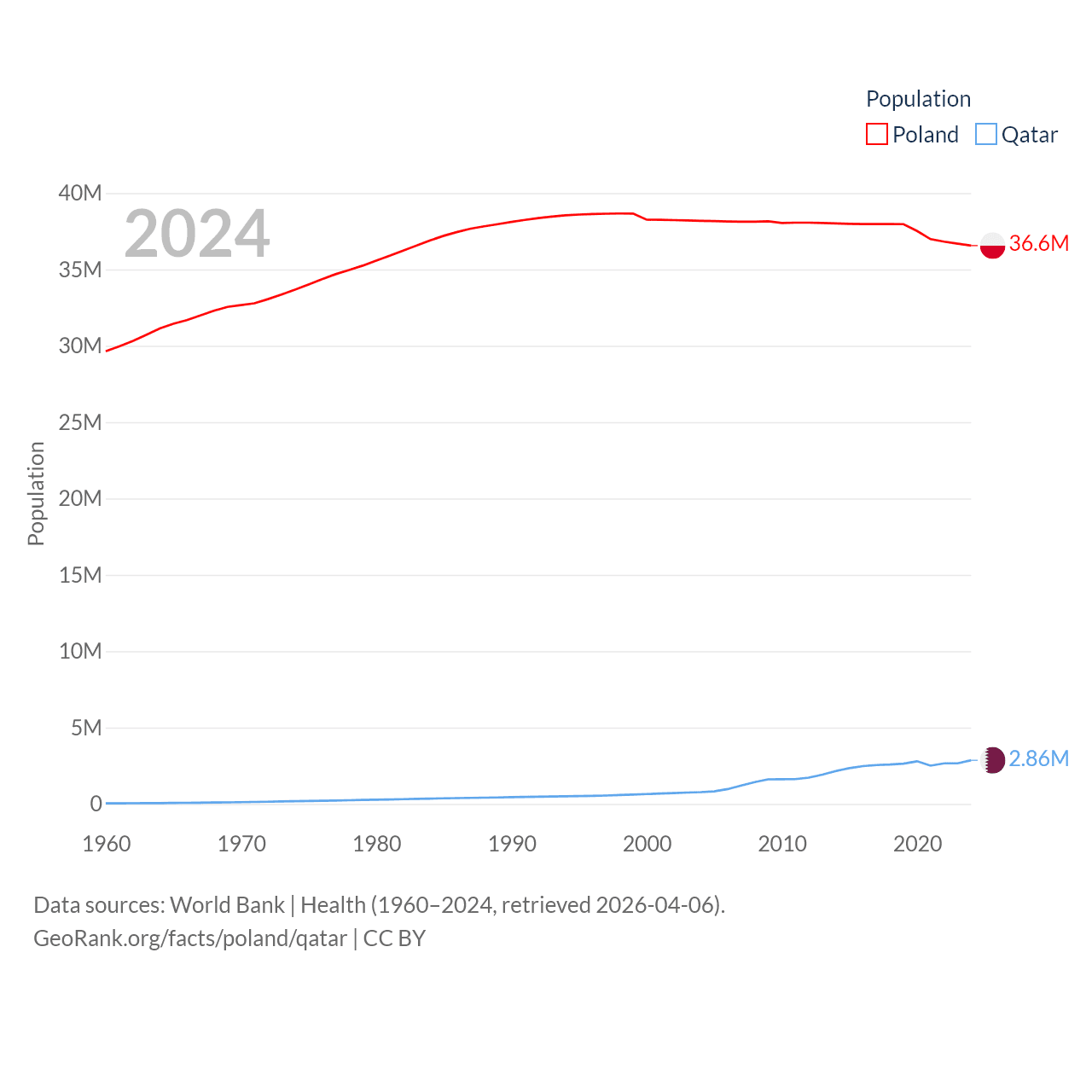 Poland has a population of 36.6M (ranked 42/197), compared with 2.86M in Qatar (ranked 138/197). Poland's land area is 118,252 sq mi versus 4,436 sq mi for Qatar (ranked 69th vs. 158th).