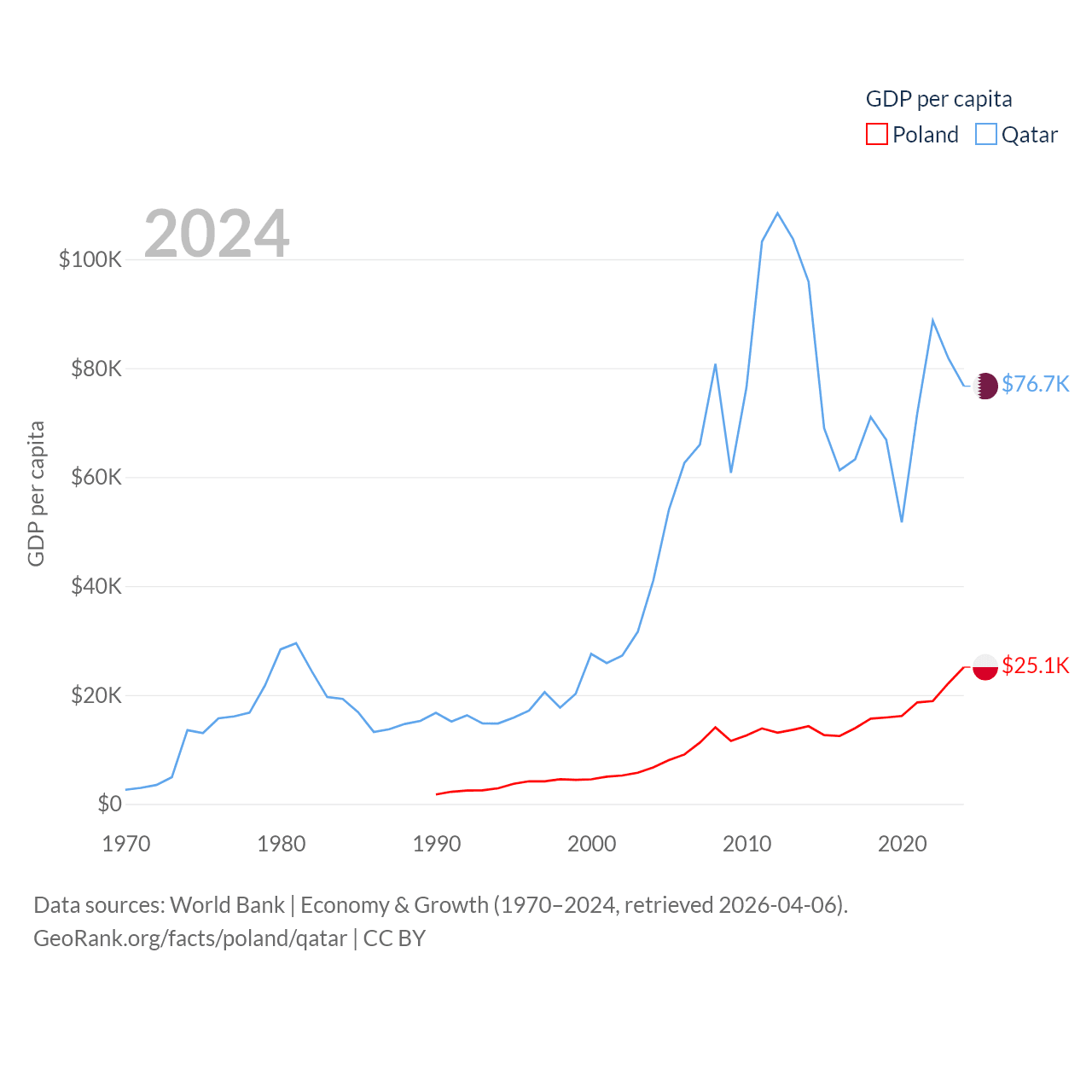 By GDP, Poland ranks 21/197 ($918B) and Qatar ranks 56/197 ($219B). By GDP per capita, Poland ranks 48/197 ($25,104), while Qatar ranks 11/197 ($76,689).