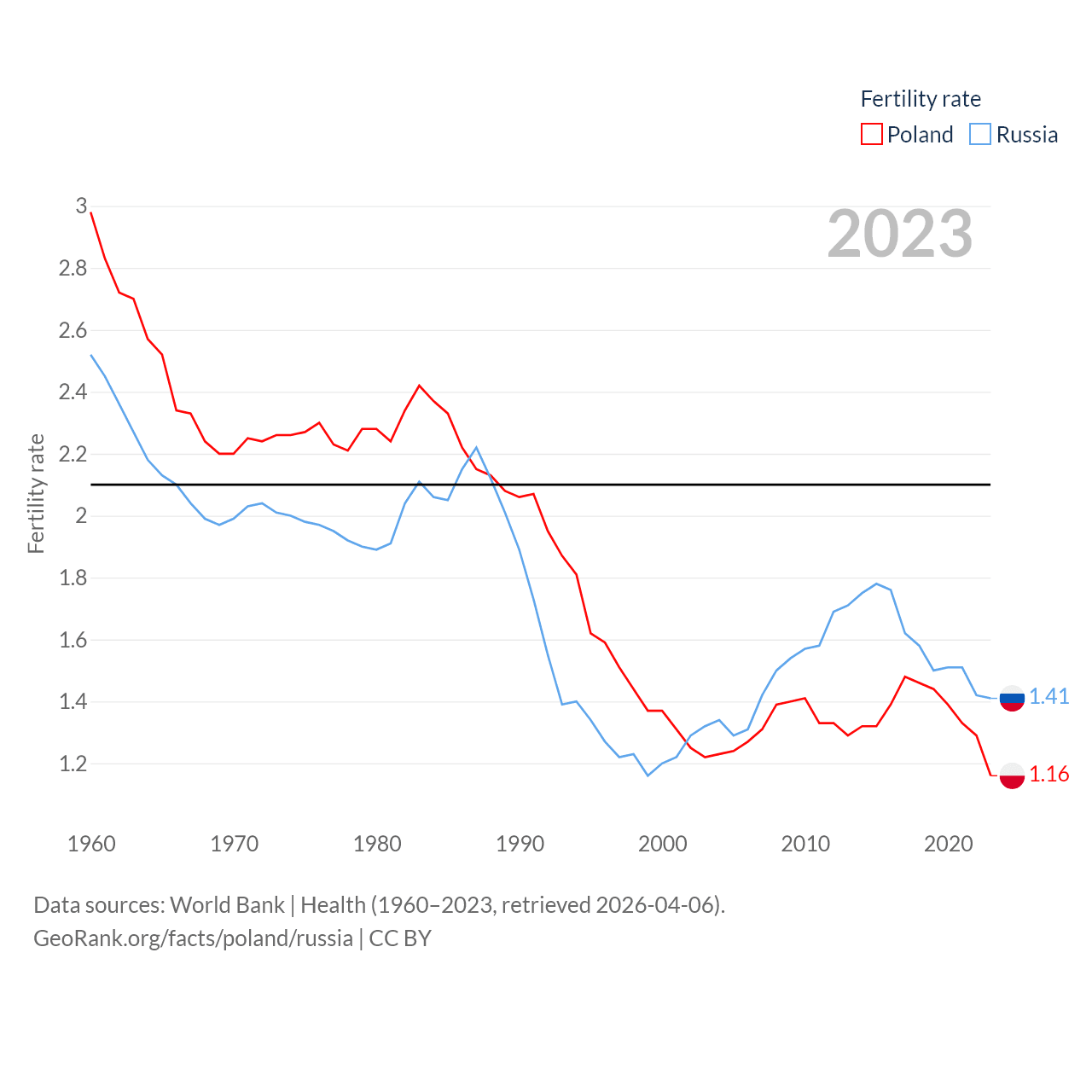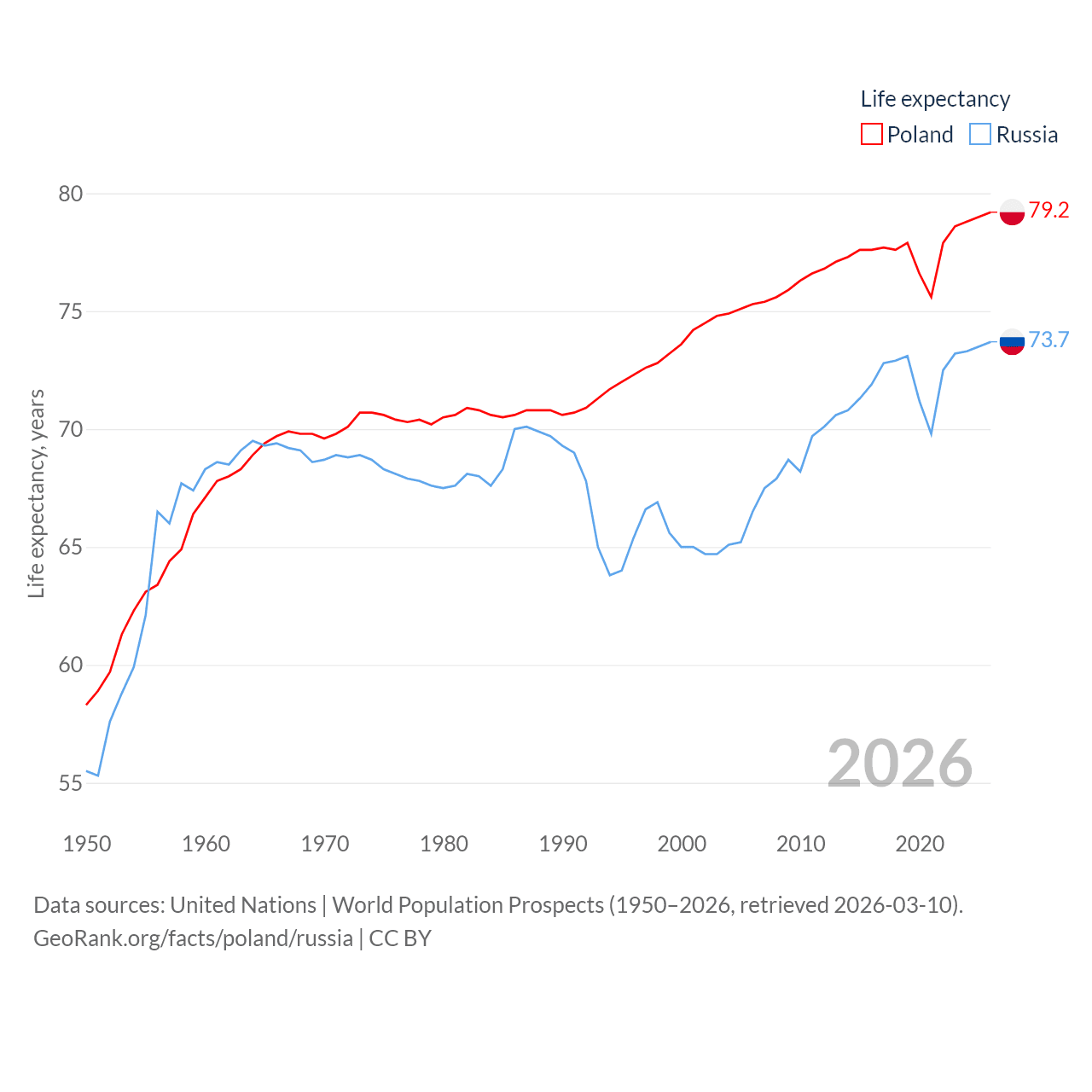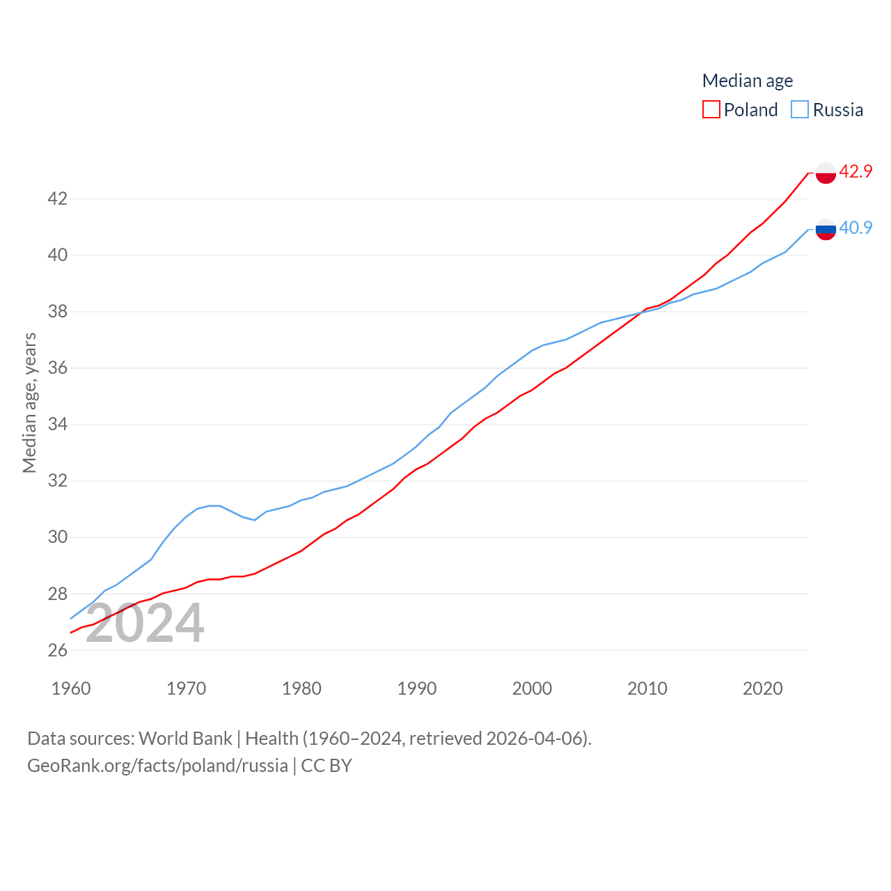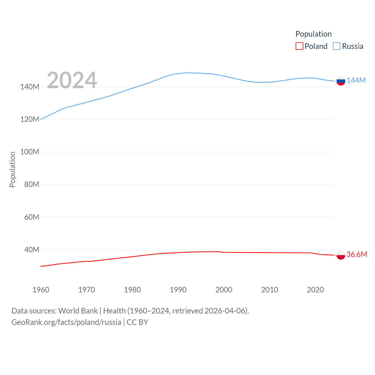Poland has a population of 36.6M (ranked 42/197), compared with 144M in Russia (ranked 9/197). Poland's land area is 118,252 sq mi versus 6,323,145 sq mi for Russia (ranked 69th vs. 1st).