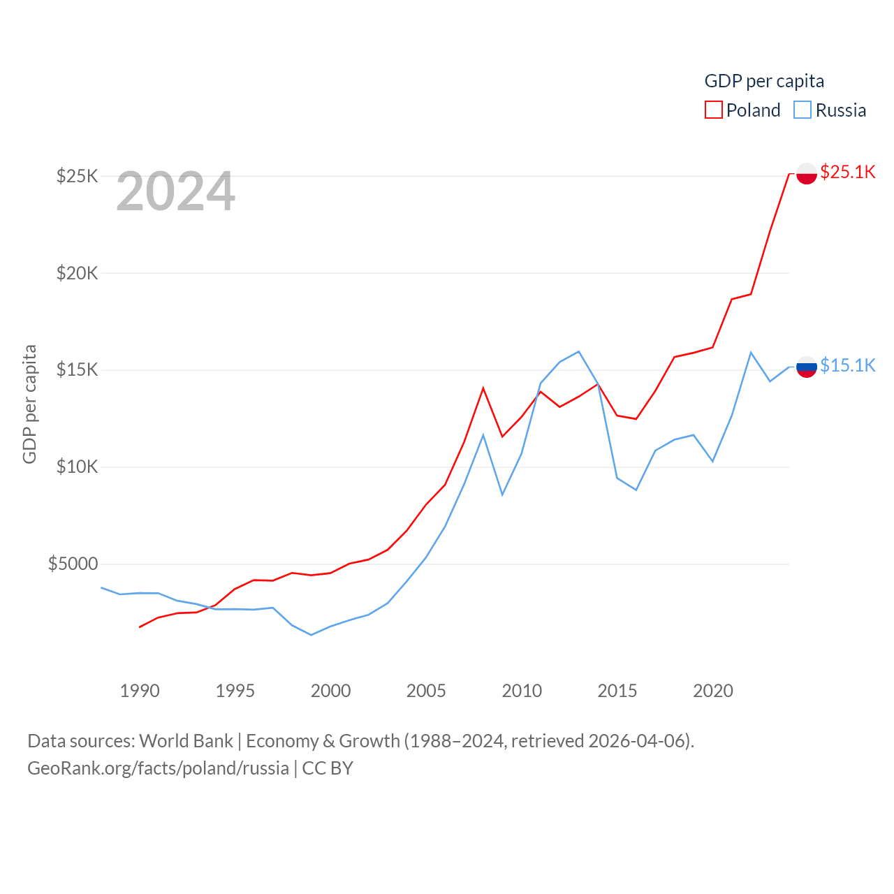 By GDP, Poland ranks 21/197 ($918B) and Russia ranks 11/197 ($2.17T). By GDP per capita, Poland ranks 48/197 ($25,104), while Russia ranks 68/197 ($15,145).