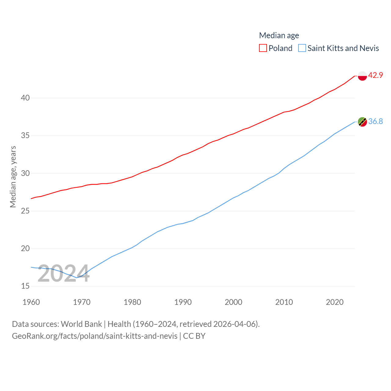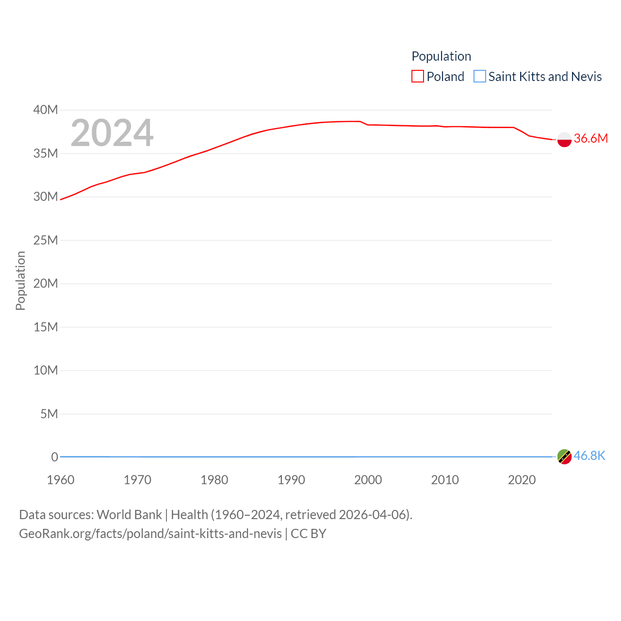 Poland has a population of 36.6M (ranked 42/197), compared with 46.8K in Saint Kitts and Nevis (ranked 189/197). Poland's land area is 118,252 sq mi versus 100.4 sq mi for Saint Kitts and Nevis (ranked 69th vs. 189th).