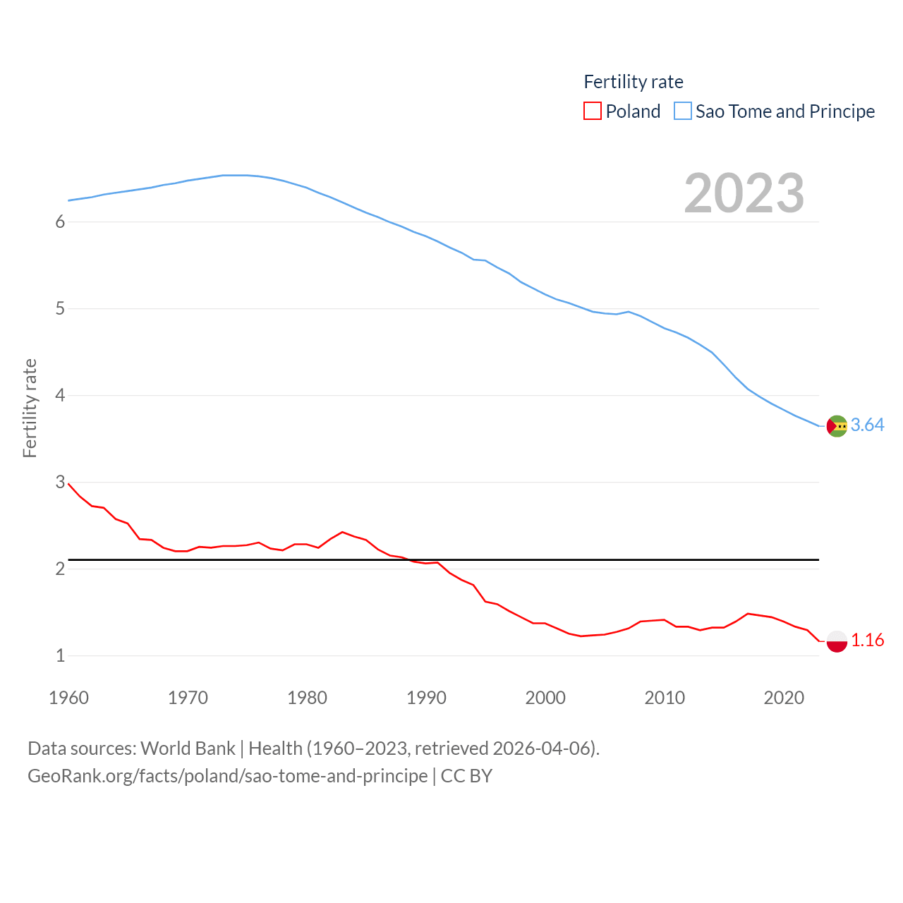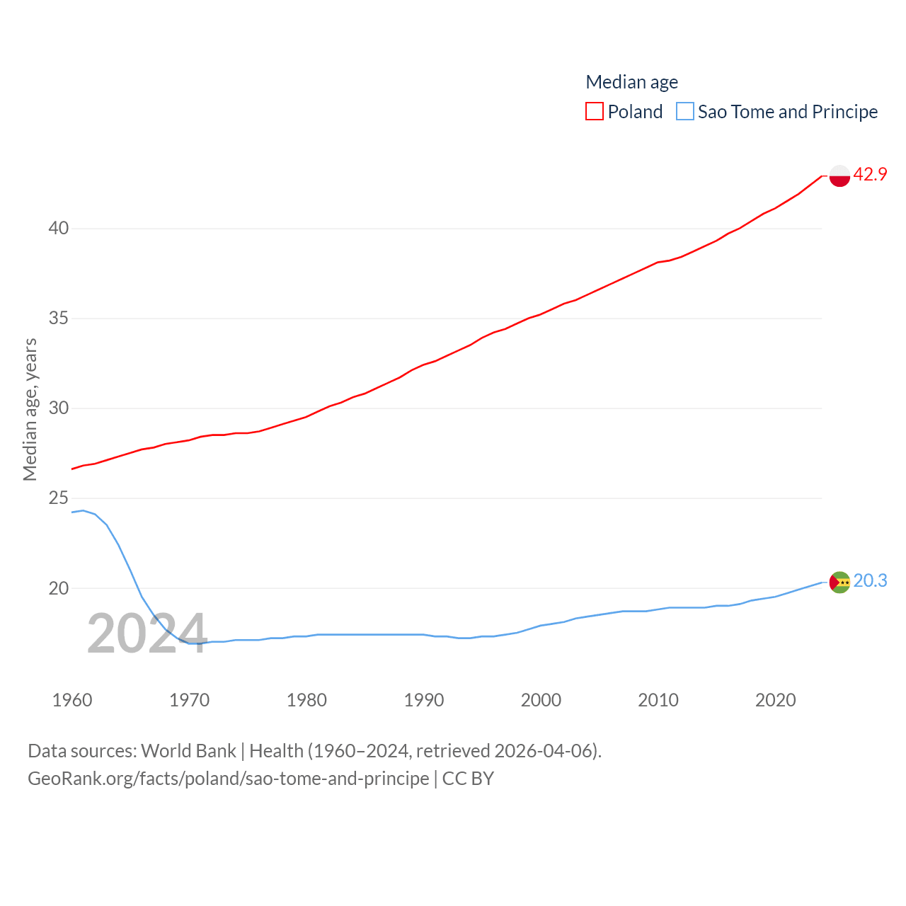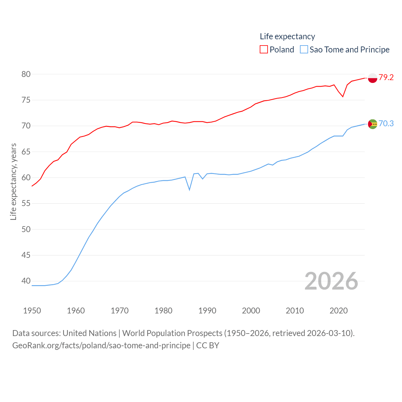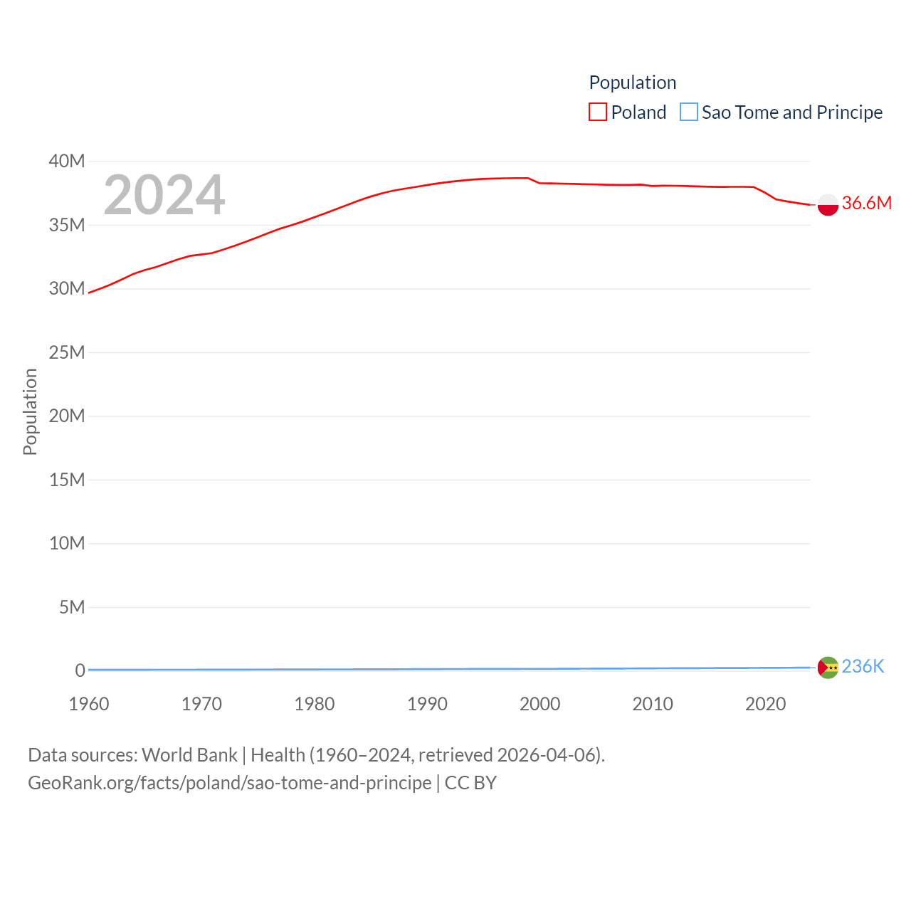 Poland has a population of 36.6M (ranked 42/197), compared with 236K in Sao Tome and Principe (ranked 176/197). Poland's land area is 118,252 sq mi versus 371 sq mi for Sao Tome and Principe (ranked 69th vs. 172nd).