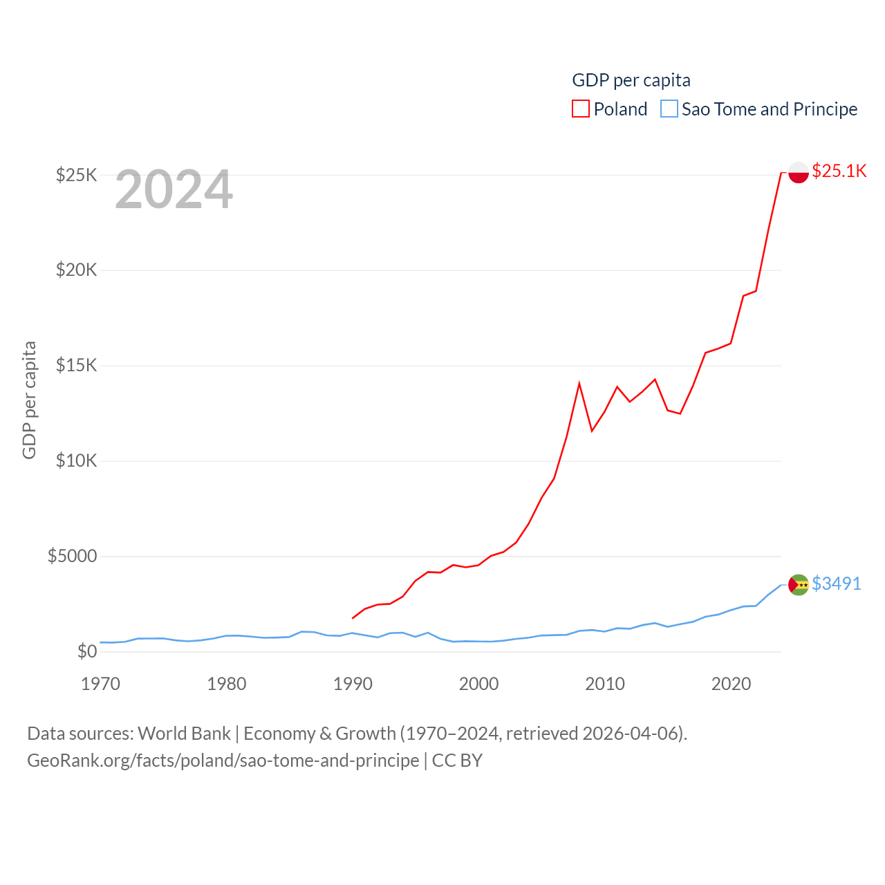 By GDP, Poland ranks 21/197 ($918B) and Sao Tome and Principe ranks 189/197 ($822M). By GDP per capita, Poland ranks 48/197 ($25,104), while Sao Tome and Principe ranks 134/197 ($3,491).