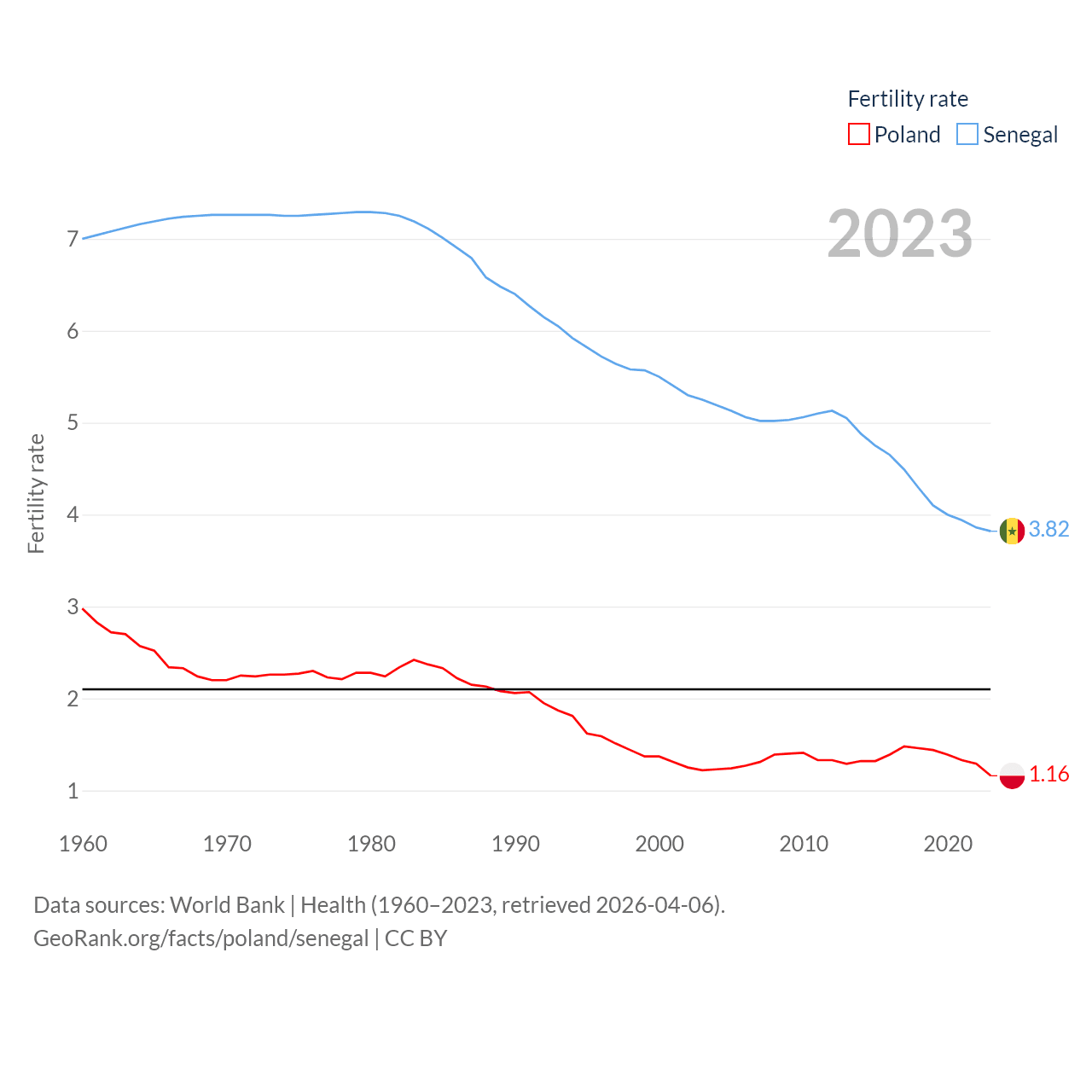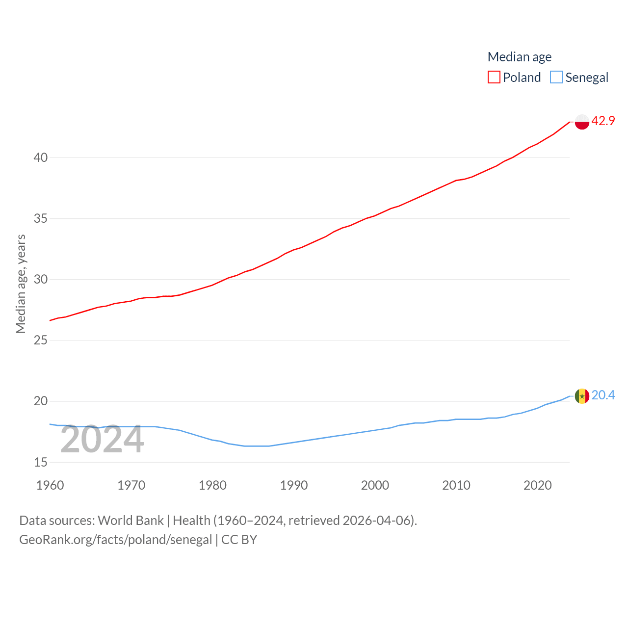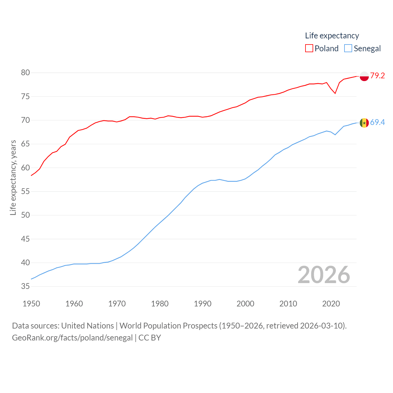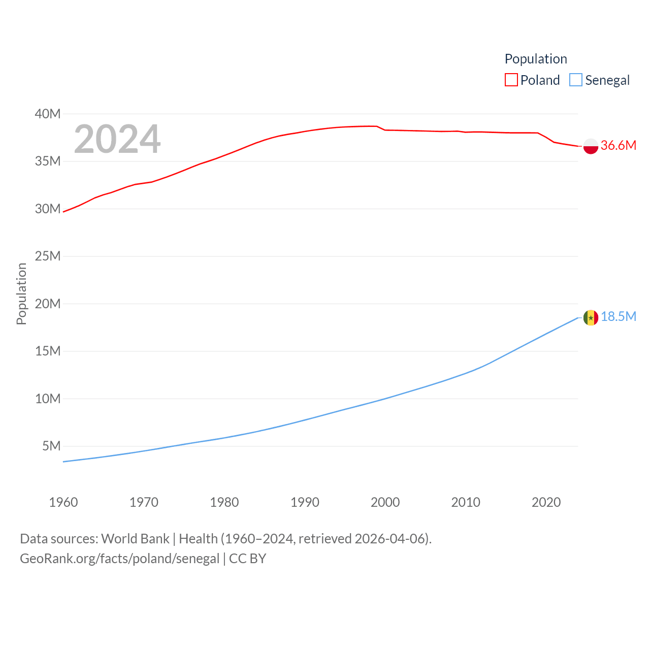Poland has a population of 36.6M (ranked 42/197), compared with 18.5M in Senegal (ranked 69/197). Poland's land area is 118,252 sq mi versus 74,336 sq mi for Senegal (ranked 69th vs. 85th).