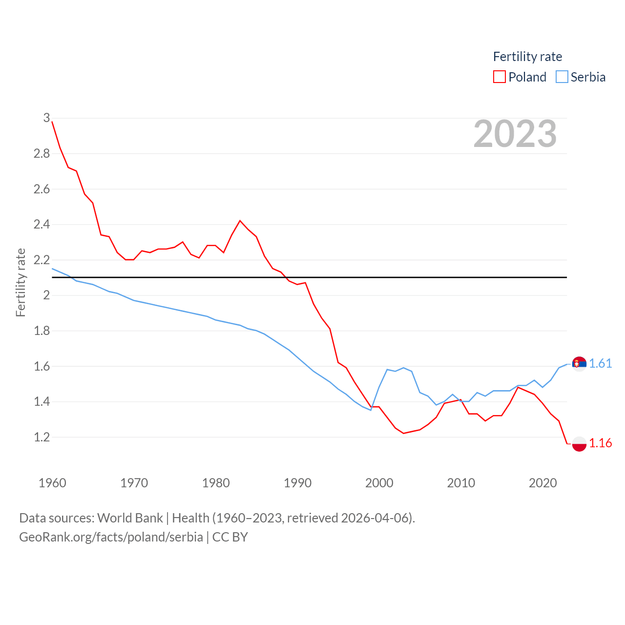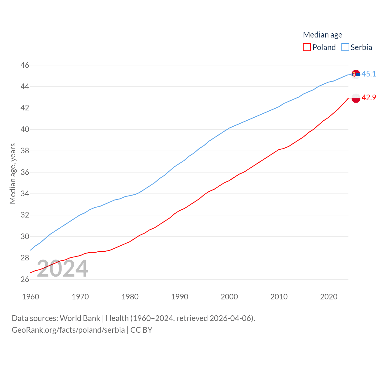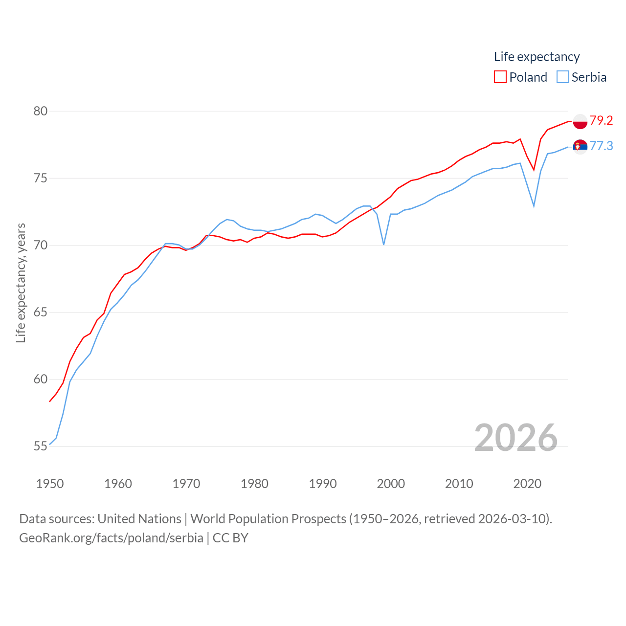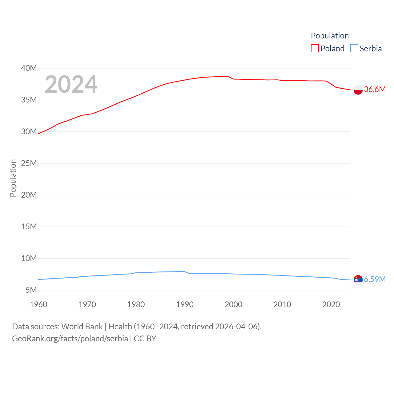 Poland has a population of 36.6M (ranked 42/197), compared with 6.59M in Serbia (ranked 109/197). Poland's land area is 118,252 sq mi versus 32,467 sq mi for Serbia (ranked 69th vs. 111th).