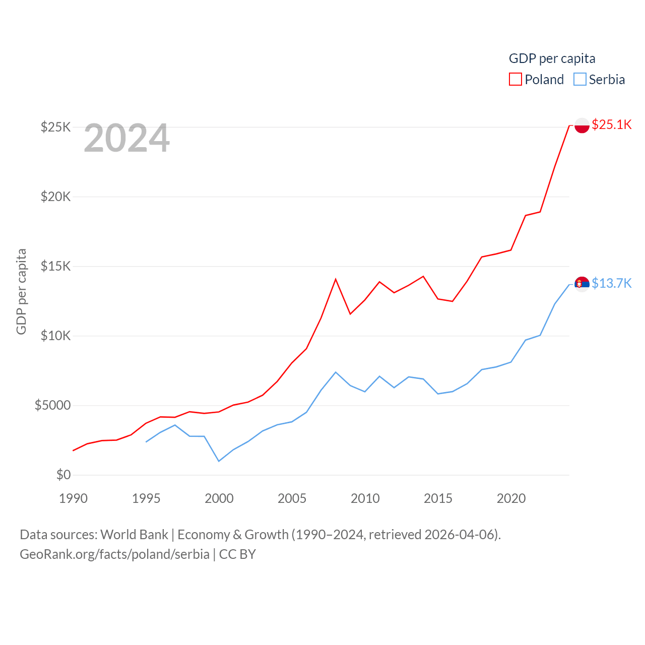 By GDP, Poland ranks 21/197 ($918B) and Serbia ranks 76/197 ($90.1B). By GDP per capita, Poland ranks 48/197 ($25,104), while Serbia ranks 73/197 ($13,679).
