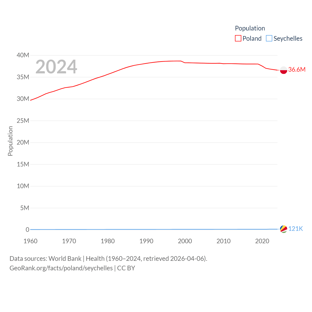 Poland has a population of 36.6M (ranked 42/197), compared with 121K in The Seychelles (ranked 181/197). Poland's land area is 118,252 sq mi versus 177.6 sq mi for The Seychelles (ranked 69th vs. 181st).