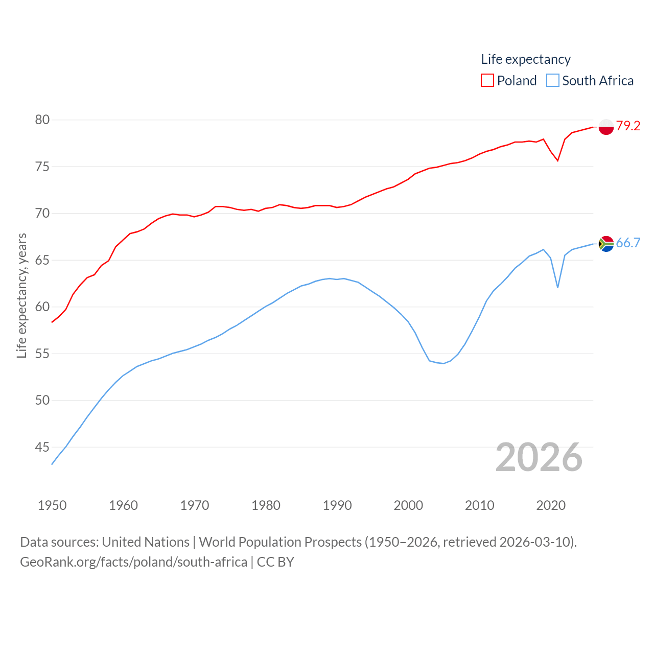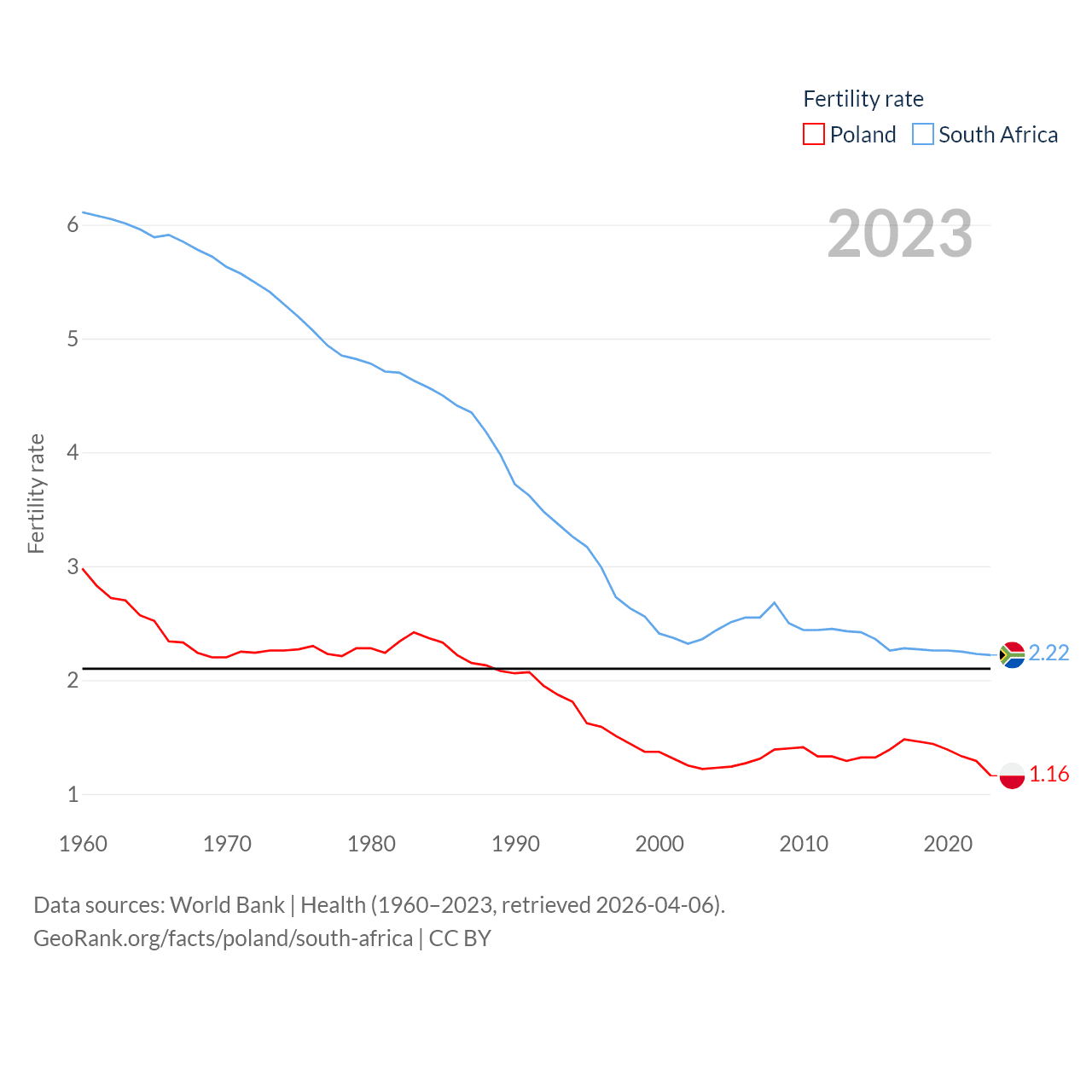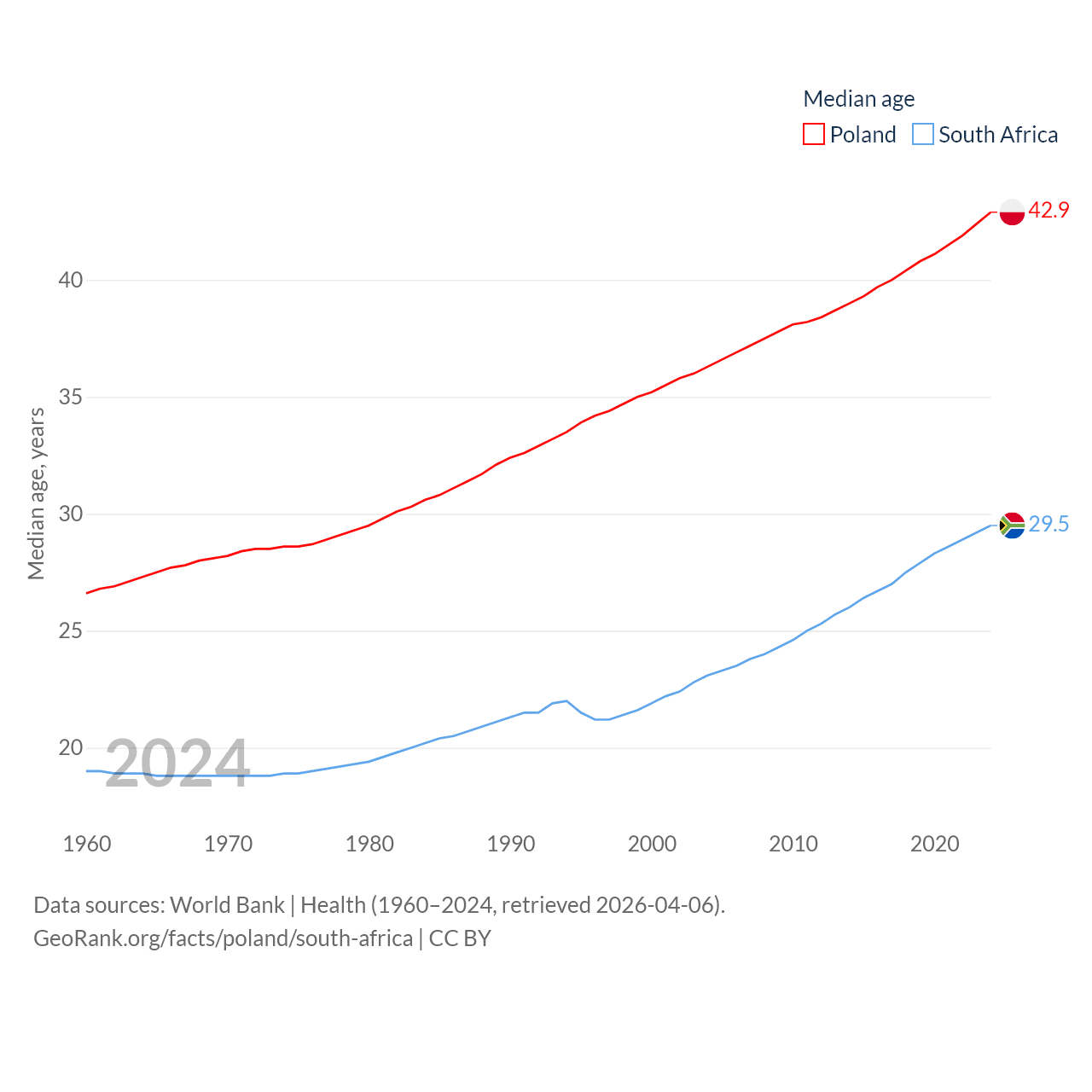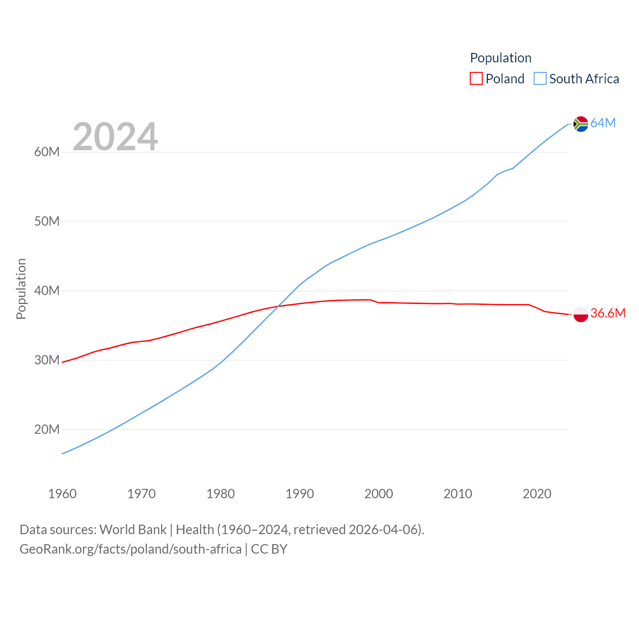 Poland has a population of 36.6M (ranked 42/197), compared with 64M in South Africa (ranked 24/197). Poland's land area is 118,252 sq mi versus 468,377 sq mi for South Africa (ranked 69th vs. 24th).