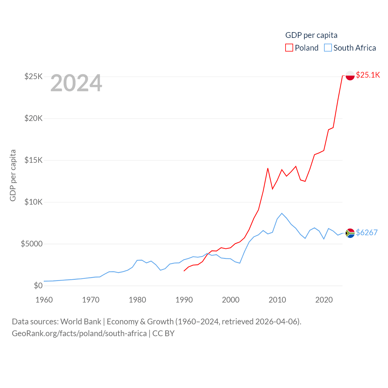 By GDP, Poland ranks 21/197 ($918B) and South Africa ranks 40/197 ($401B). By GDP per capita, Poland ranks 48/197 ($25,104), while South Africa ranks 111/197 ($6,267).